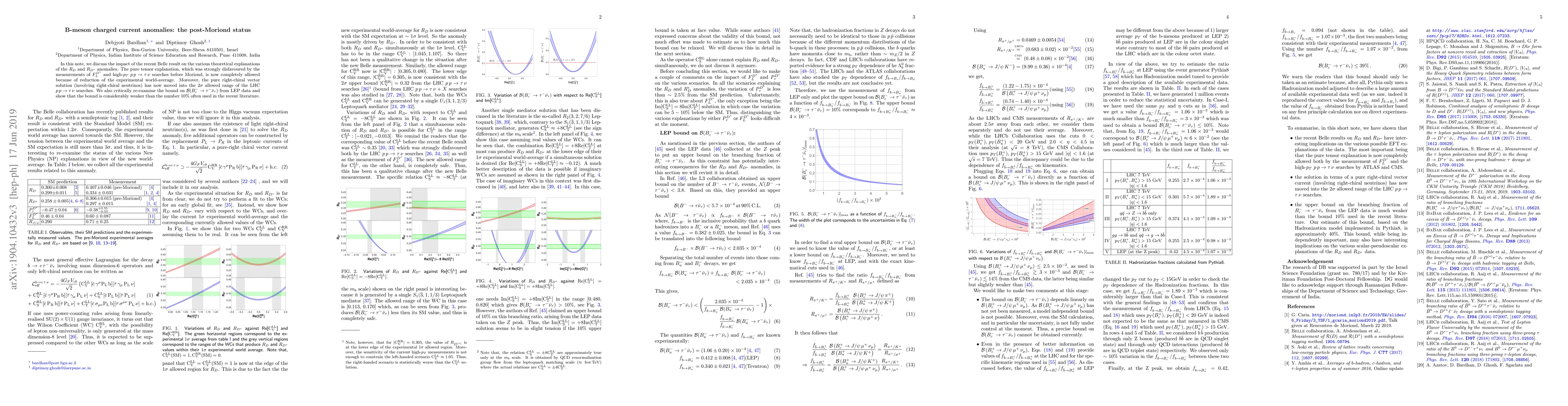 In this note, we discuss the impact of the recent Belle result on the various theoretical explanations of the $R_D$ and $R_{D^*}$ anomalies. The pure tensor explanation, which was strongly disfavoured by the measurements of $F_L^{D^*}$ and high-$p_T$ $p \, p \to \tau \, \nu$ searches before Moriond, is now completely allowed because of reduction of the experimental world-average. Moreover, the pure right-chiral vector solution (involving right-chiral neutrinos) has now moved into the $2\sigma$ allowed range of the LHC $p \, p \to \tau \, \nu$ searches. We also critically re-examine the bound on $\mathcal{B}(B_c^- \to \tau^- \bar{\nu}_\tau)$ from LEP data and show that the bound is considerably weaker than the number $10\%$ often used in the recent literature.