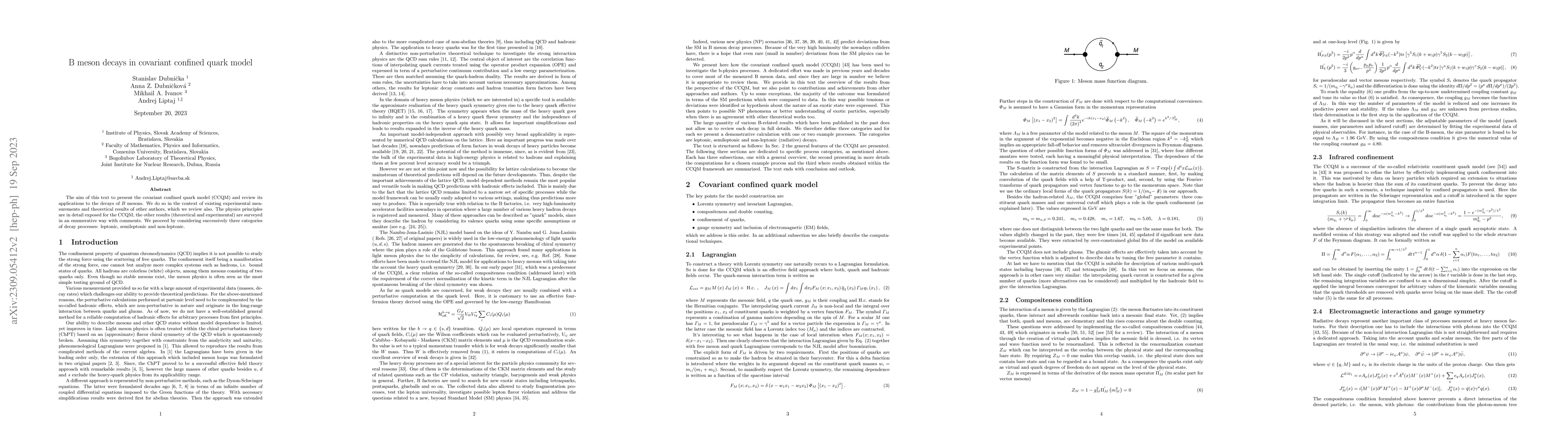 This paper introduces the covariant confined quark model (CCQM) and applies it to analyze the decay processes of B mesons, categorizing them into leptonic, semileptonic, and non-leptonic decays, and comparing the model's predictions with existing experimental and theoretical results.