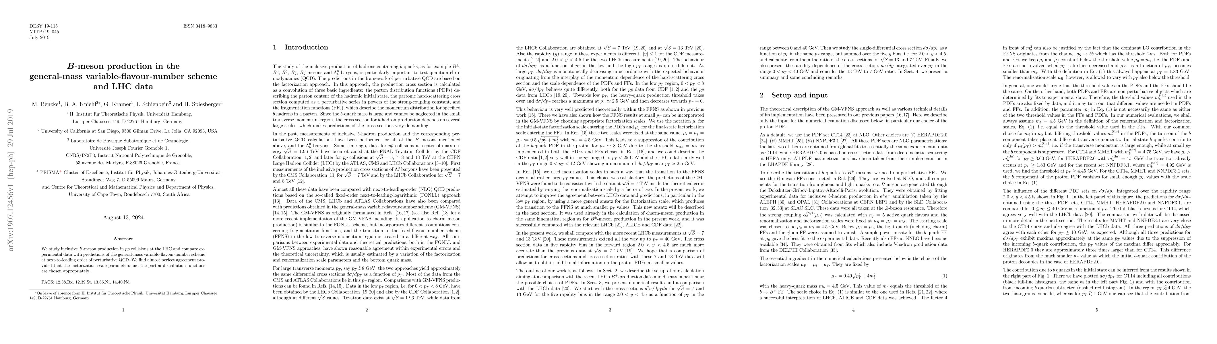 This paper investigates $B$-meson production in proton-proton collisions at the LHC, comparing experimental data with theoretical predictions from the general-mass variable-flavour-number scheme. The study finds excellent agreement when optimal factorization scale parameters and parton distribution functions are used.