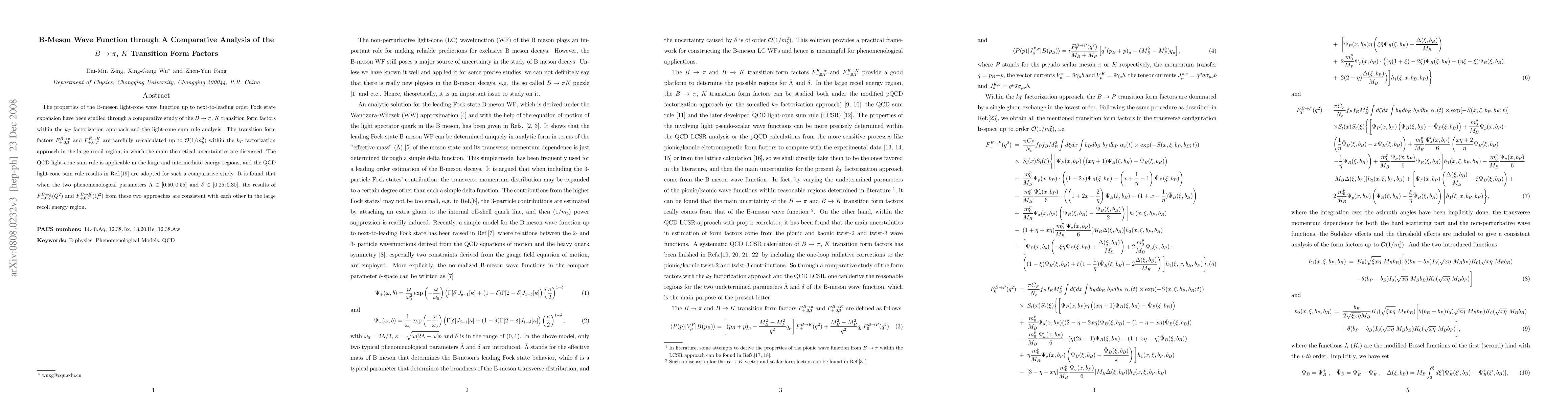 This paper investigates the B-meson light-cone wave function using a comparative analysis of $B\to \pi$ and $B\to K$ transition form factors within the $k_T$ factorization approach and light-cone sum rule analysis. Results show consistency between the two methods when specific phenomenological parameters are within given ranges.