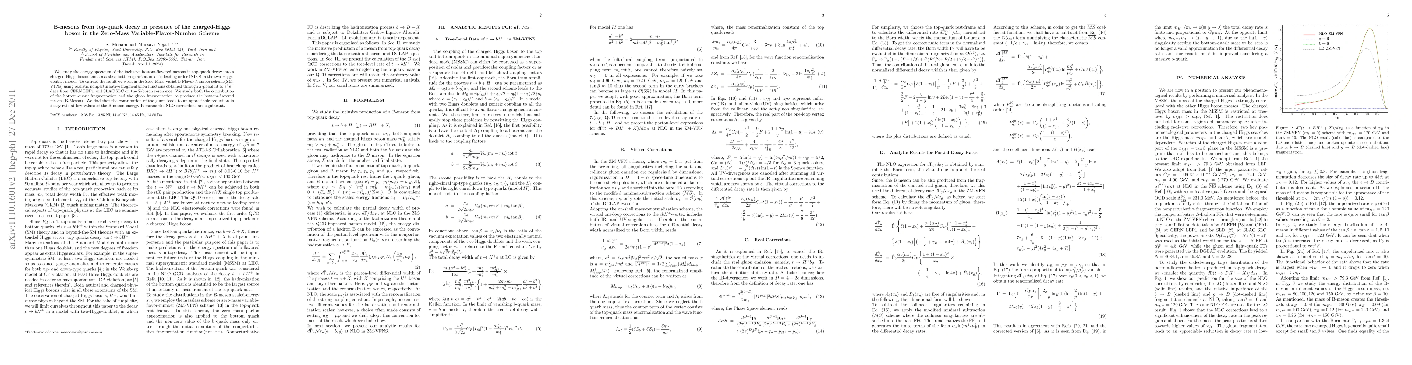 This paper investigates the energy spectrum of inclusive bottom-flavored mesons from top-quark decay in the presence of a charged-Higgs boson, using the Zero-Mass Variable-Flavor-Number scheme and next-to-leading order calculations. It finds that gluon fragmentation significantly reduces the decay rate at low B-meson energies, indicating substantial next-to-leading order corrections.