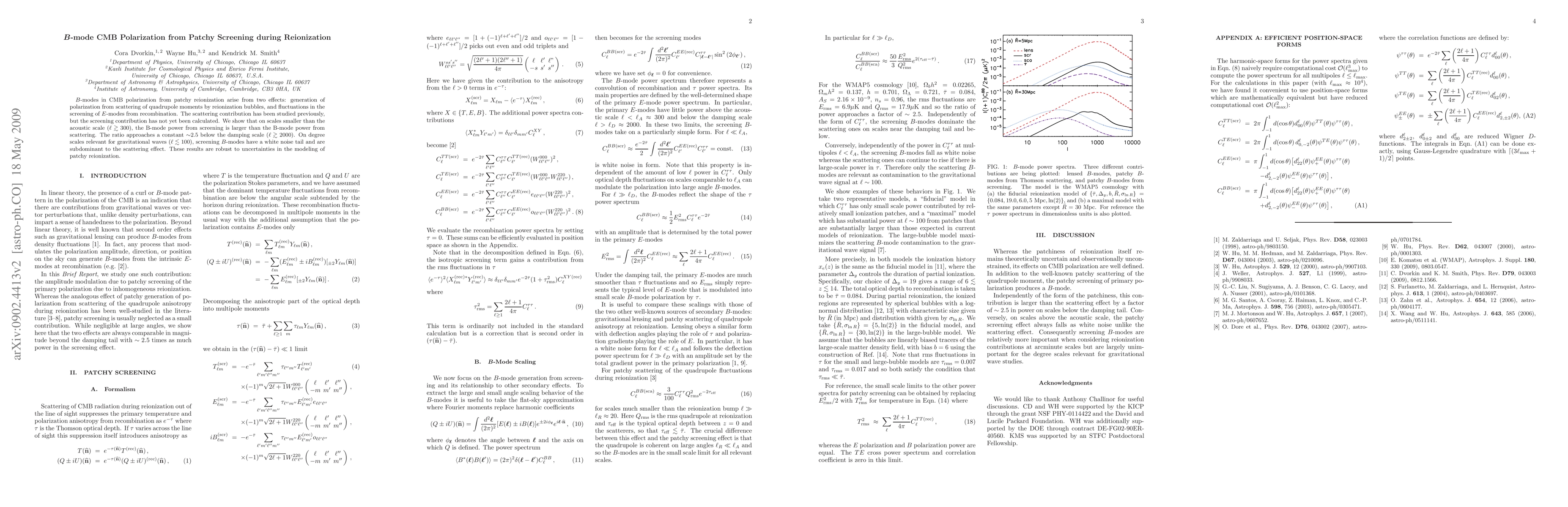 This paper investigates B-mode polarization in the Cosmic Microwave Background (CMB) caused by patchy reionization, finding that screening fluctuations from recombination dominate over scattering effects on scales larger than 300. On smaller scales, scattering becomes more significant, though screening contributes a white noise tail.