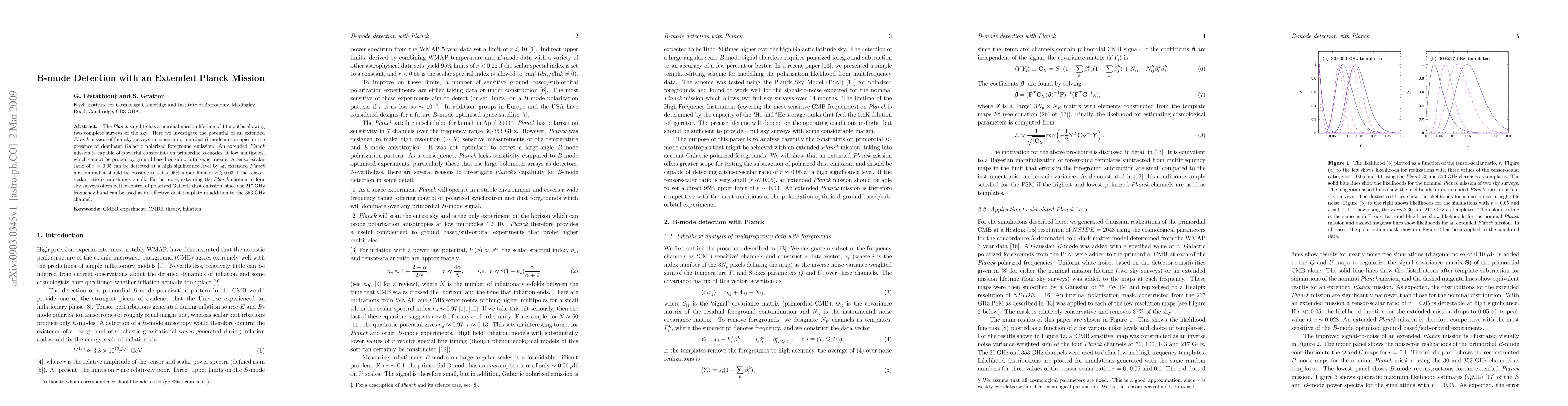 This paper explores the benefits of extending the Planck satellite mission to four sky surveys to better detect primordial B-mode anisotropies, which are challenging to observe due to Galactic foregrounds. An extended mission could detect a tensor-scalar ratio of r=0.05 with high significance and set a 95% upper limit of r=0.03 if the ratio is very small.