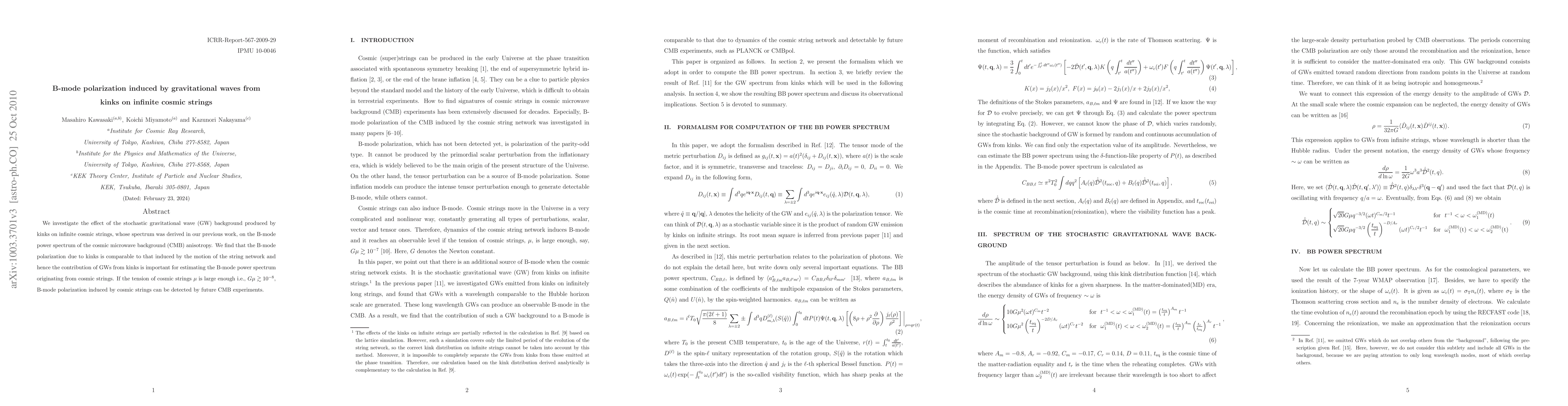 This paper examines how gravitational waves from kinks on infinite cosmic strings affect the B-mode power spectrum of cosmic microwave background anisotropy. It finds that the B-mode polarization from these kinks is significant and detectable by future CMB experiments if the cosmic string tension is sufficiently large.