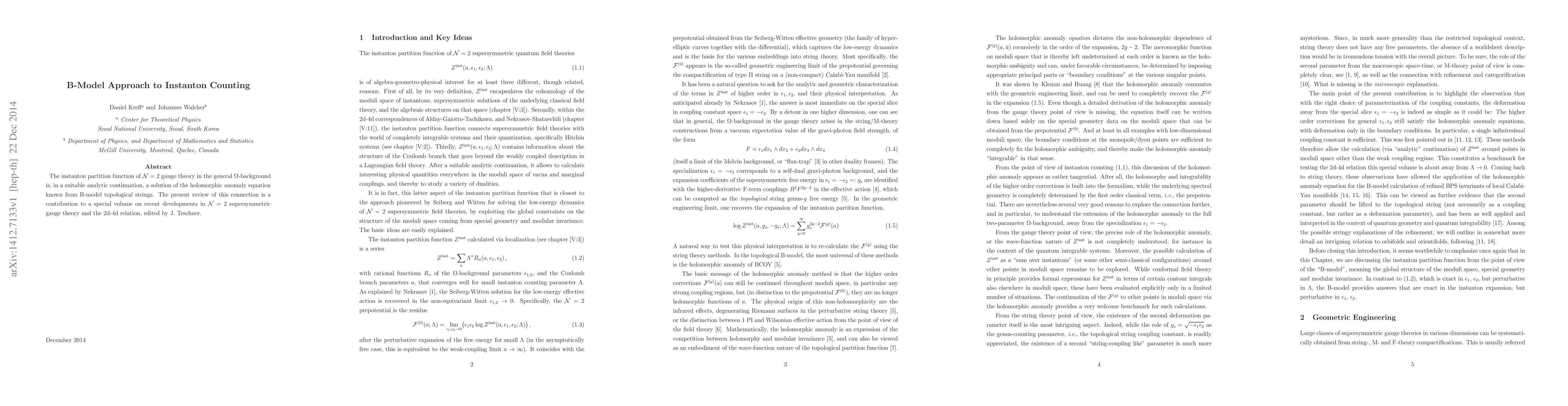 This paper explores the connection between instanton partition functions and the topological string partition function from the B-model perspective, showing that instanton solutions resolve the holomorphic anomaly equations of the topological string.