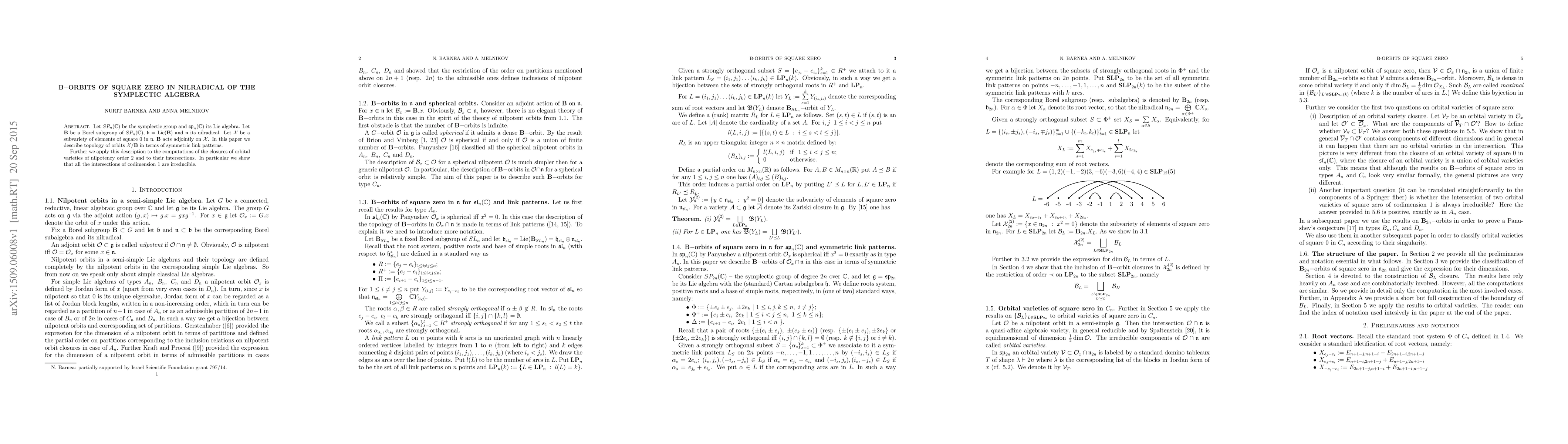Let $SP_n(\mathbb{C})$ be the symplectic group and $\mathfrak{sp}_n(\mathbb{C})$ its Lie algebra. Let $B$ be a Borel subgroup of $SP_n(\mathbb{C} )$, $\mathfrak{b}={\rm Lie}(B)$ and $\mathfrak n$ its nilradical. Let $\mathcal X$ be a subvariety of elements of square 0 in $\mathfrak n.$ $B$ acts adjointly on $\mathcal X$. In this paper we describe topology of orbits $\mathcal X/B$ in terms of symmetric link patterns. Further we apply this description to the computations of the closures of orbital varieties of nilpotency order 2 and to their intersections. In particular we show that all the intersections of codimension 1 are irreducible.