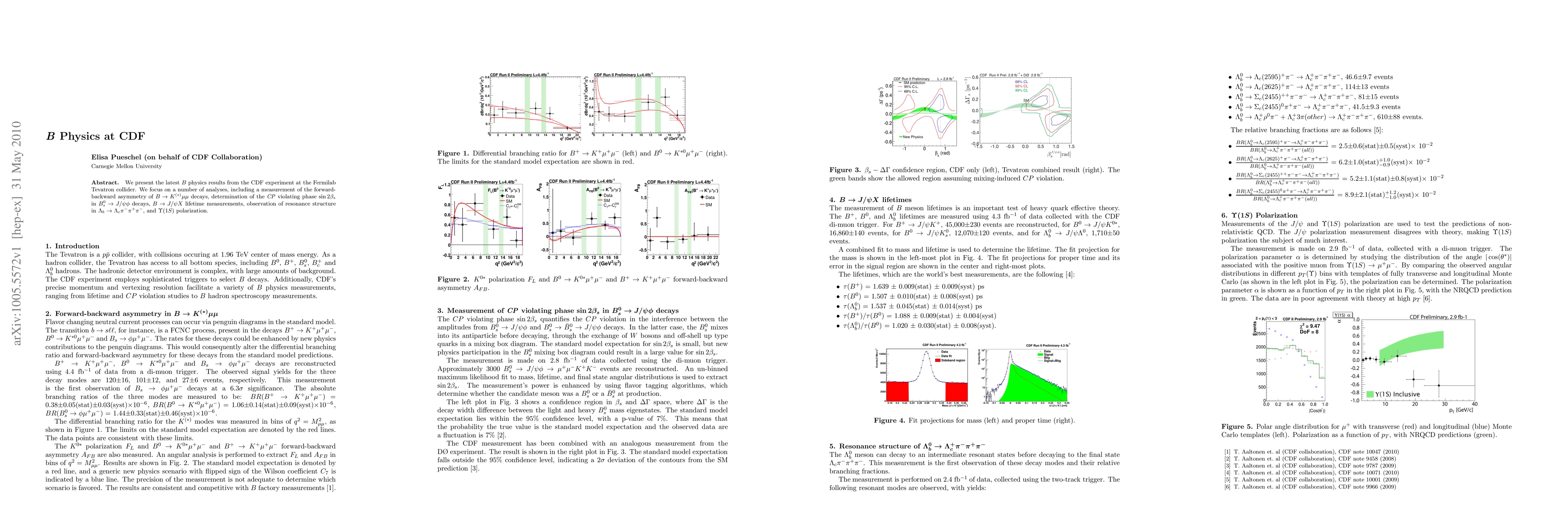 This paper reports the latest B physics results from the CDF experiment at the Fermilab Tevatron, including measurements of the forward-backward asymmetry in B -> K^(*) mu mu decays, determination of the CP violating phase sin2beta_s in B^0_s-> J/psi phi decays, and observations of resonance structure in Lambda_b -> Lambda_c 3pi.
