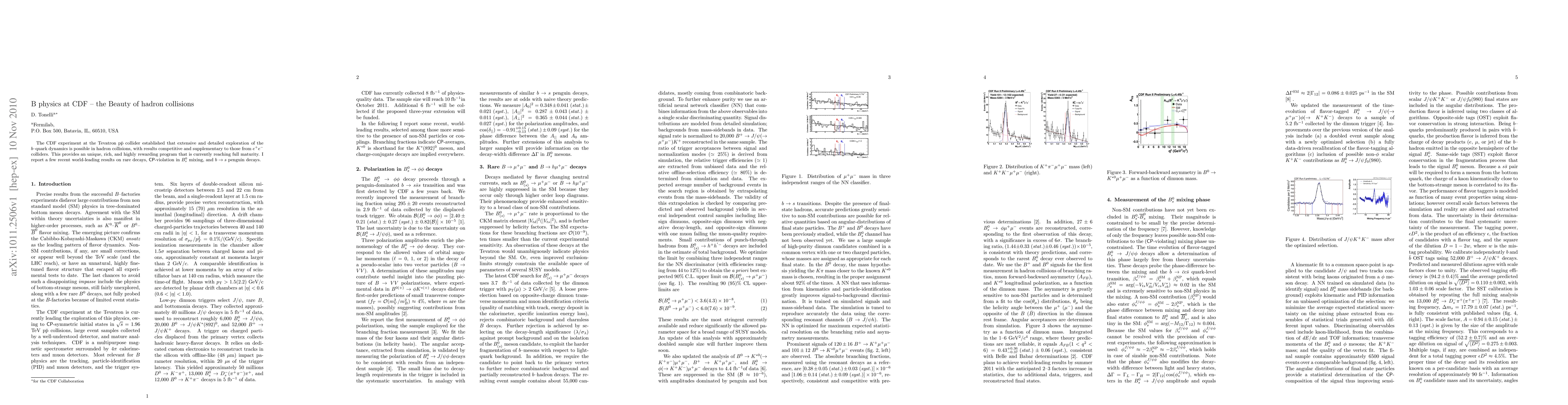 The CDF experiment at the Tevatron p-pbar collider established that extensive and detailed exploration of the b-quark dynamics is possible in hadron collisions, with results competitive and supplementary to those from e+e- colliders. This provides an unique, rich, and highly rewarding program that is currently reaching full maturity. I report a few recent world-leading results on rare decays, CP-violation in Bs mixing, and b-> s penguin decays.