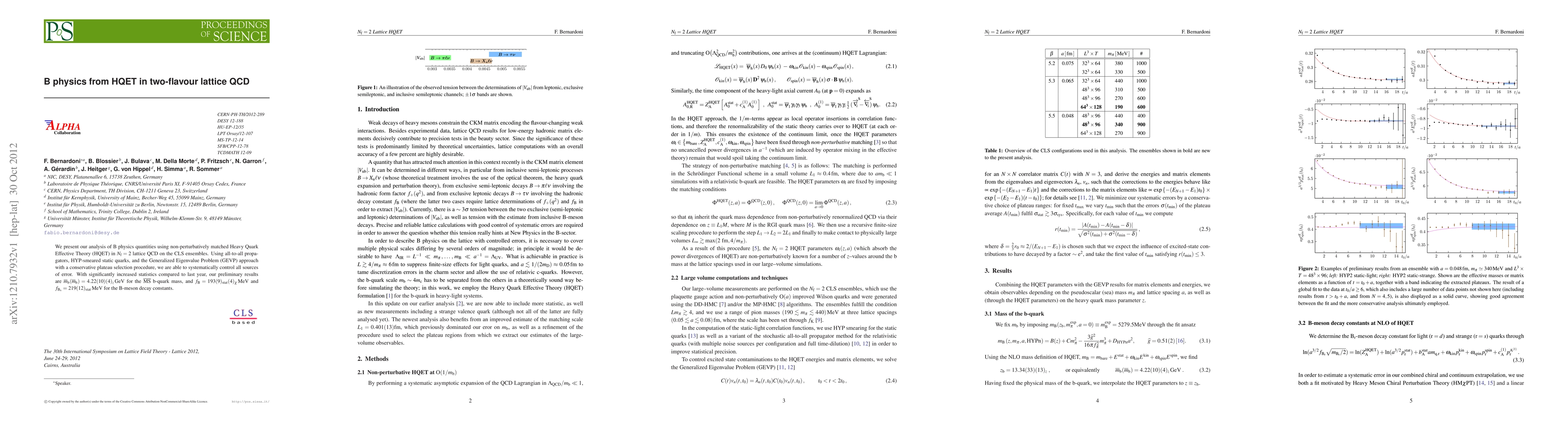 We present our analysis of B physics quantities using non-perturbatively matched Heavy Quark Effective Theory (HQET) in Nf= 2 lattice QCD on the CLS ensembles. Using all-to-all propagators, HYP-smeared static quarks, and the Generalized Eigenvalue Problem (GEVP) approach with a conservative plateau selection procedure, we are able to systematically control all sources of error. With significantly increased statistics compared to last year, our preliminary results are mb (mb) = 4.22(10)(4)z GeV for the MS b-quark mass, and fB = 193(9)stat (4)_\chi MeV and fBs = 219(12)stat MeV for the B-meson decay constants.
