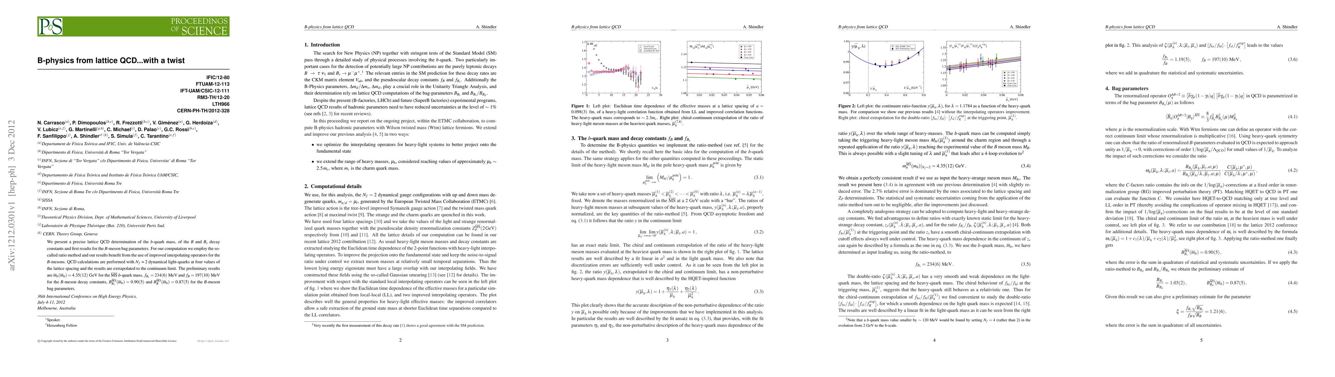 We present a precise lattice QCD determination of the b-quark mass, of the B and Bs decay constants and first results for the B-meson bag parameters. For our computation we employ the so-called ratio method and our results benefit from the use of improved interpolating operators for the B-mesons. QCD calculations are performed with Nf = 2 dynamical light-quarks at four values of the lattice spacing and the results are extrapolated to the continuum limit. The preliminary results are mb(mb) = 4.35(12) GeV for the MSbar b-quark mass, fBs = 234(6) MeV and fB = 197(10) MeV for the B-meson decay constants, BBs(mb) = 0.90(5) and BB(mb) = 0.87(5) for the B-meson bag parameters.