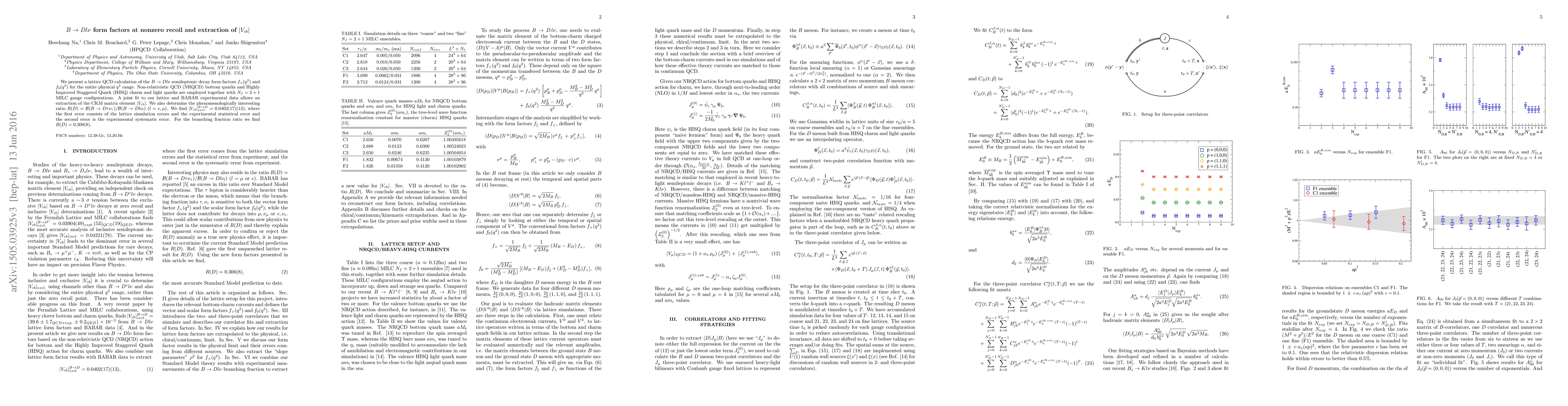 Researchers calculate $B ightarrow D l u$ form factors and extract the CKM matrix element $|V_{cb}|$, leading to a branching fraction ratio $R(D) = 0.300(8)$.