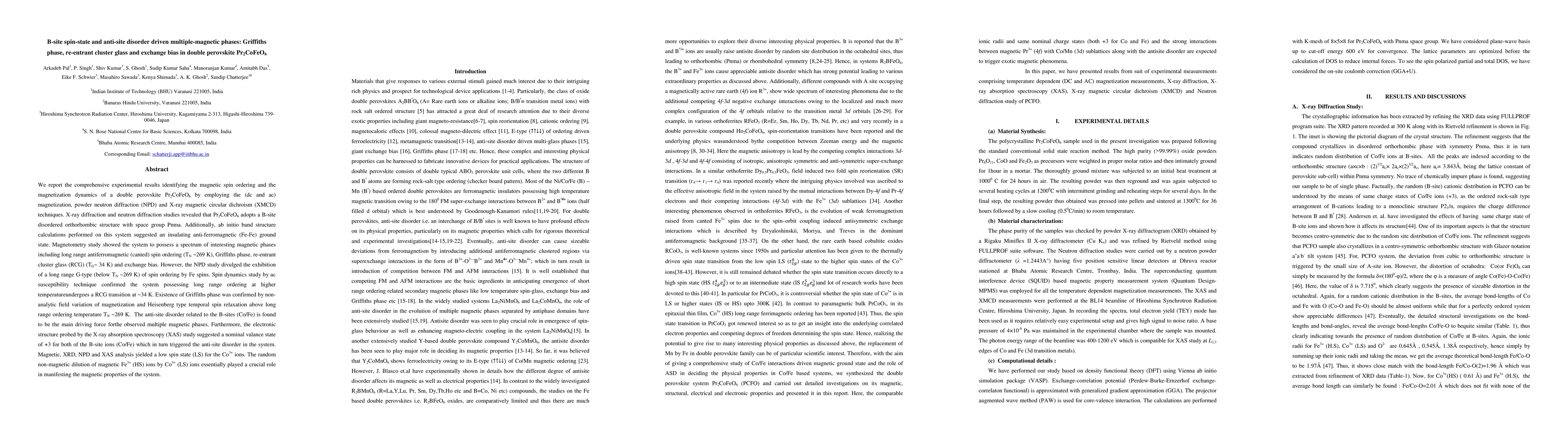 This double perovskite Pr2CoFeO6 compound exhibits multiple magnetic phases due to anti-site disorder, including a Griffiths phase, re-entrant cluster glass, and exchange bias, driven by the interaction between Co3+ and Fe3+ ions.