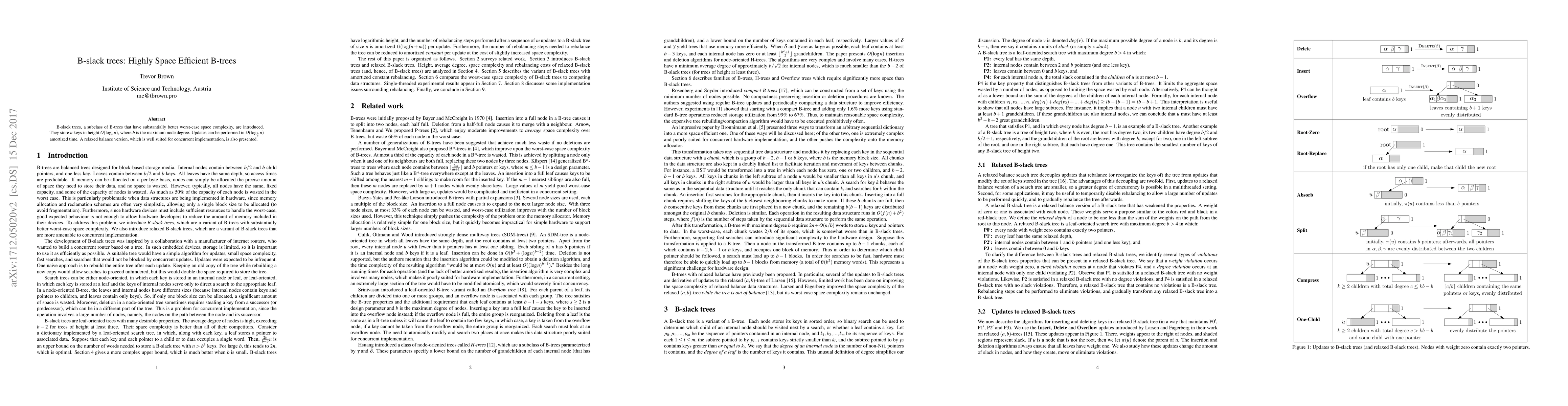 B-slack trees offer a highly space-efficient variant of B-trees with improved worst-case space complexity, maintaining $n$ keys in height $O(\log_b n)$. They allow updates in $O(\log_{\frac b 2} n)$ amortized time, and a concurrent version is also available.