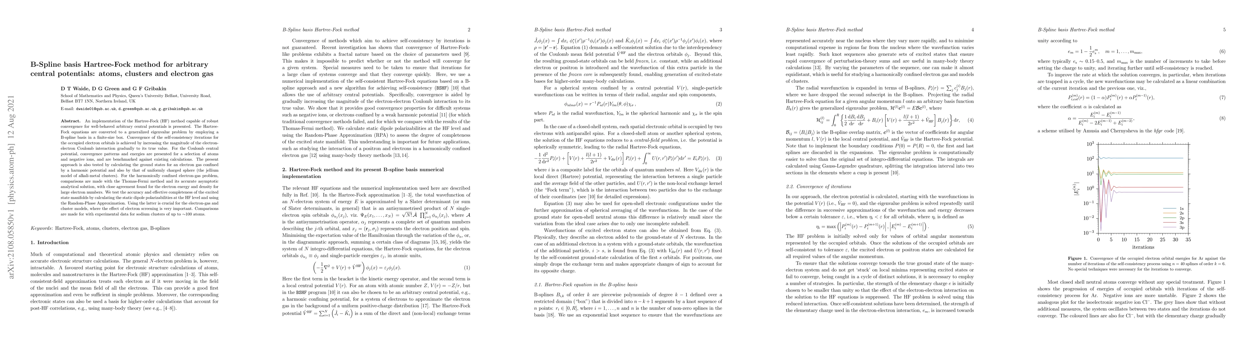 An implementation of the Hartree-Fock (HF) method capable of robust convergence for well-behaved arbitrary central potentials is presented. The Hartree-Fock equations are converted to a generalized eigenvalue problem by employing a B-spline basis in a finite-size box. Convergence of the self-consistency iterations for the occupied electron orbitals is achieved by increasing the magnitude of the electron-electron Coulomb interaction gradually to its true value. For the Coulomb central potential, convergence patterns and energies are presented for a selection of atoms and negative ions, and are benchmarked against existing calculations. The present approach is also tested by calculating the ground states for an electron gas confined by a harmonic potential and also by that of uniformly charged sphere (the jellium model of alkali-metal clusters). For the harmonically confined electron-gas problem, comparisons are made with the Thomas-Fermi method and its accurate asymptotic analytical solution, with close agreement found for the electron energy and density for large electron numbers. We test the accuracy and effective completeness of the excited state manifolds by calculating the static dipole polarizabilities at the HF level and using the Random-Phase Approximation. Using the latter is crucial for the electron-gas and cluster models, where the effect of electron screening is very important. Comparisons are made for with experimental data for sodium clusters of up to $\sim $100 atoms.