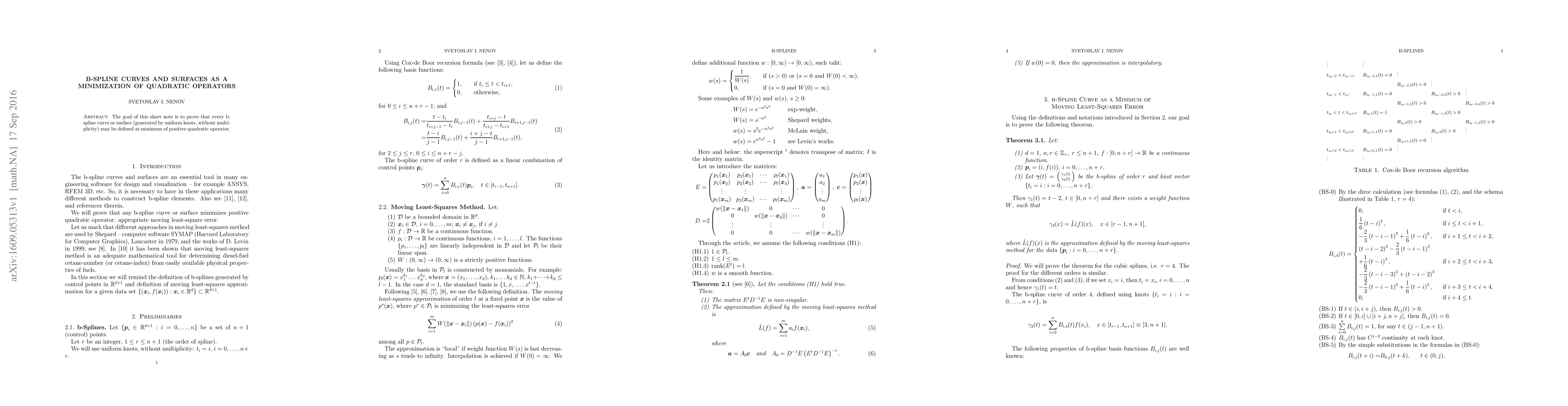 Summary: This paper demonstrates that b-spline curves and surfaces, generated by uniform knots without multiplicity, can be defined as the minimum of a positive quadratic operator, providing a novel minimization-based characterization of these geometric constructs.