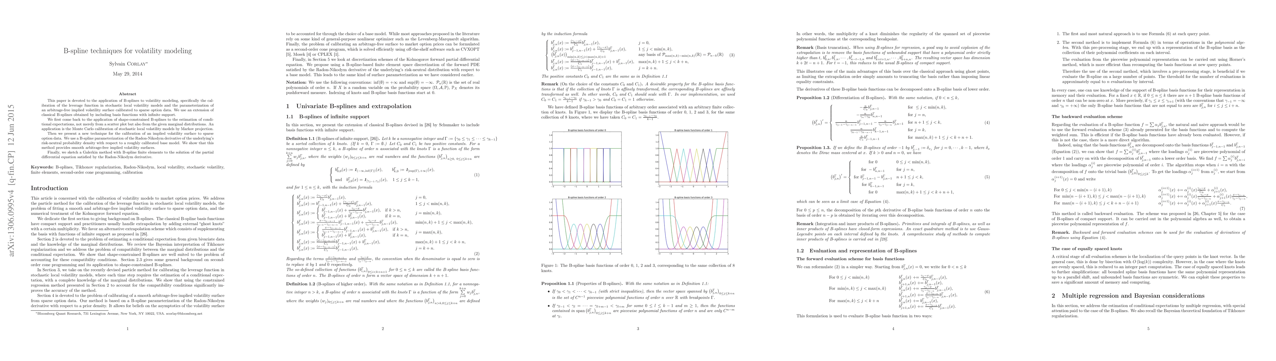 This paper applies B-spline techniques to volatility modeling, focusing on the calibration of leverage functions in stochastic local volatility models and the construction of arbitrage-free implied volatility surfaces from sparse option data, utilizing shape-constrained B-splines and a novel Radon-Nikodym derivative parameterization.