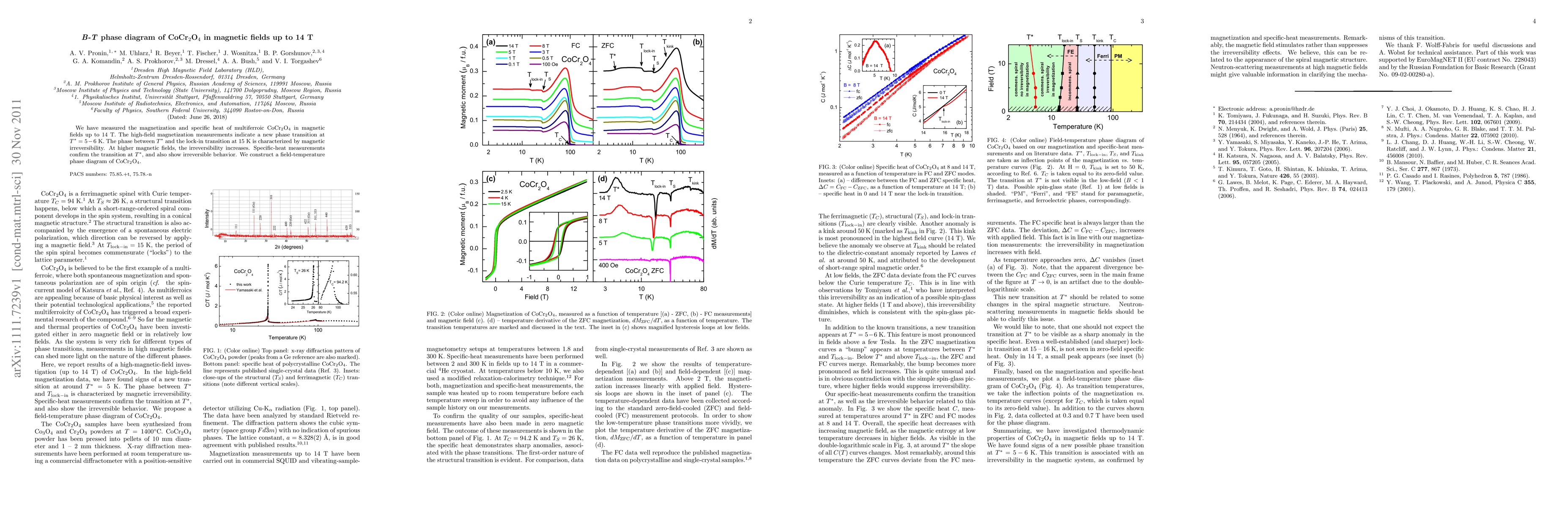 We have measured the magnetization and specific heat of multiferroic CoCr2O4 in magnetic fields up to 14 T. The high-field magnetization measurements indicate a new phase transition at T* = 5 - 6 K. The phase between T* and the lock-in transition at 15 K is characterized by magnetic irreversibility. At higher magnetic fields, the irreversibility increases. Specific-heat measurements confirm the transition at T*, and also show irreversible behavior. We construct a field-temperature phase diagram of CoCr2O4.