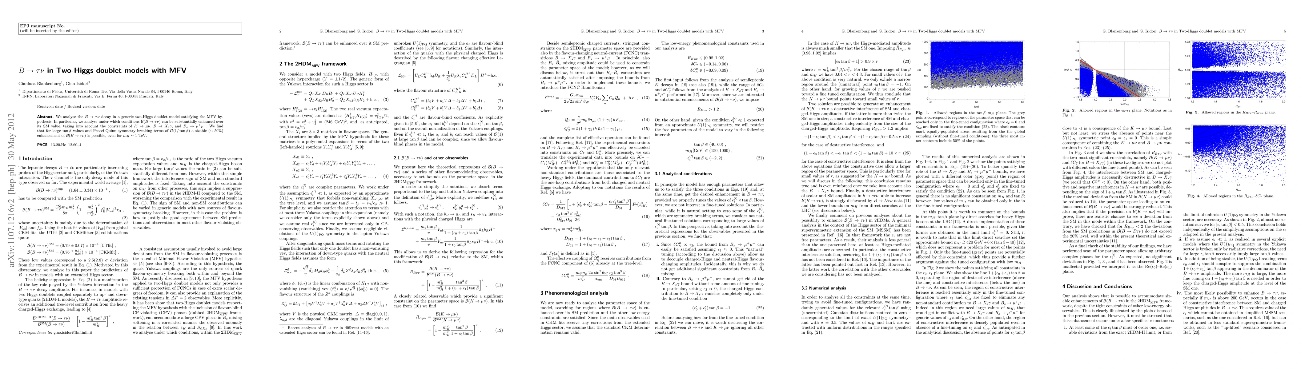We analyse the $B \rightarrow \tau \nu$ decay in a generic two-Higgs doublet model satisfying the MFV hypothesis. In particular, we analyse under which conditions $\BR(B \rightarrow \tau \nu)$ can be substantially enhanced over its SM value, taking into account the constraints of $K \rightarrow \mu\nu$, $B \rightarrow X_s \gamma$, and $B_s \rightarrow \mu^+ \mu^-$. We find that for large $\tan\beta$ values and Peccei-Quinn symmetry breaking terms of $\cO(1/\tan\beta)$ a sizable ($\sim 50%$) enhancement of $\BR(B \rightarrow \tau \nu)$ is possible, even for $m_H \sim 1$ TeV.