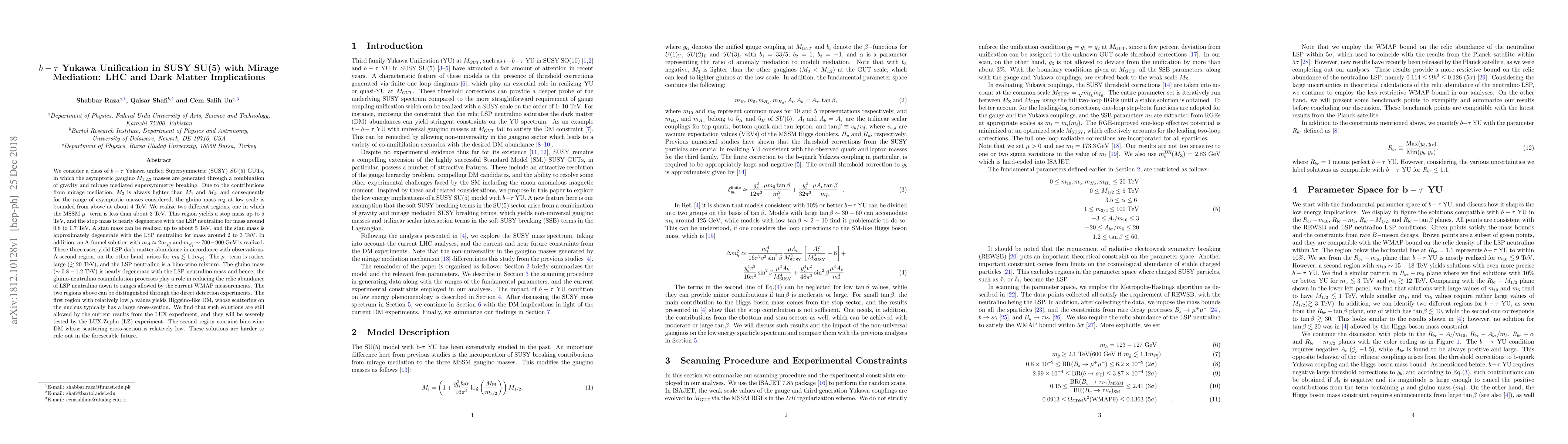 The research explores $b- au$ Yukawa unification in SUSY SU(5) GUTs with mirage mediation, finding two distinct regions for supersymmetry breaking scales. In one region, gluino mass is bounded at 4 TeV, allowing for heavy stop and stau masses nearly degenerate with the LSP neutralino. The other region, with gluino around 1.1 TeV, features large $mu$ terms and bino-wino dark matter, where gluino-neutralino coannihilation reduces relic density. Direct detection experiments can distinguish these regions, with low $mu$ region yielding Higgsino-like DM testable by LUX-Zeplin, and high $mu$ region accommodating bino-wino DM with lower cross-sections.