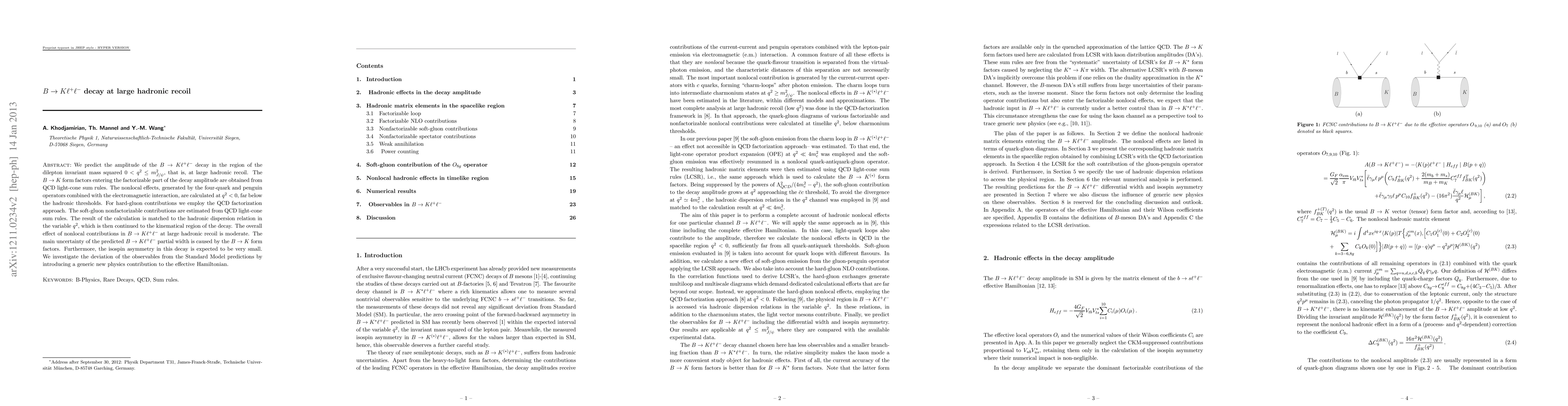 This paper predicts the amplitude of the $B\to K \ell^+\ell^-$ decay at large hadronic recoil, employing QCD light-cone sum rules and factorization approaches. The main uncertainty in the predicted partial width is attributed to $B\to K$ form factors, while nonlocal contributions are moderate, and isospin asymmetry is expected to be negligible.