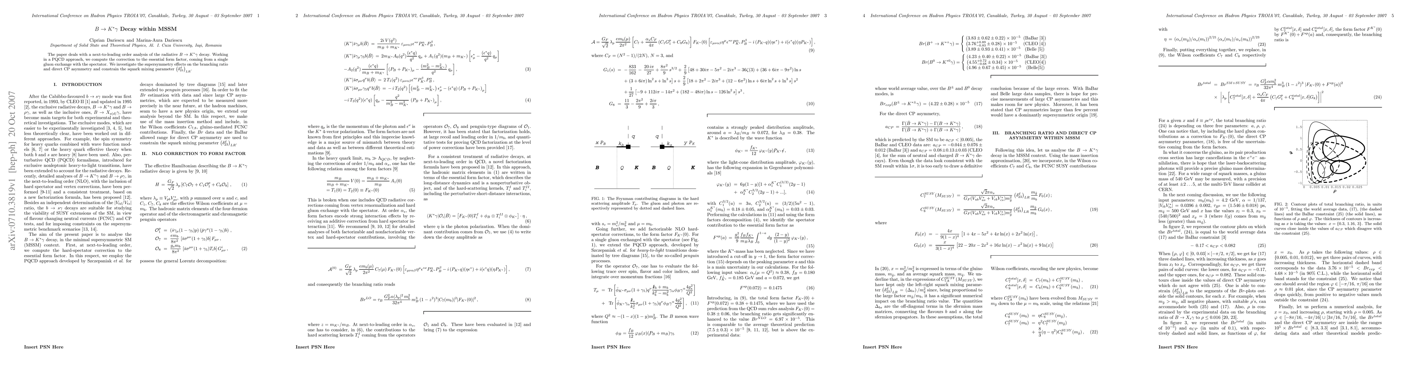The paper deals with a next-to-leading order analysis of the radiative $B \to K^* \gamma$ decay. Working in a PQCD approach, we compute the correction to the essential form factor, coming from a single gluon exchange with the spectator. We investigate the supersymmetry effects on the branching ratio and direct CP asymmetry and constrain the squark mixing parameter $(\delta_{23}^d)_{LR}$.