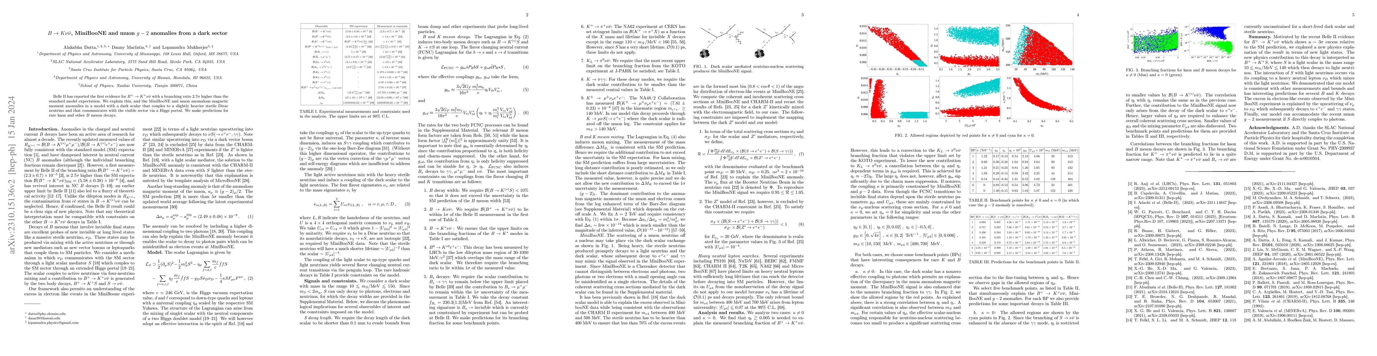 Belle II has reported the first evidence for $B^+ \to K^+\nu\bar\nu$ with a branching ratio $2.7 \sigma$ higher than the standard model expectation. We explain this, and the MiniBooNE and muon anomalous magnetic moment anomalies in a model with a dark scalar that couples to a slightly heavier sterile Dirac neutrino and that communicates with the visible sector via a Higgs portal. We make predictions for rare kaon and other $B$ meson decays.