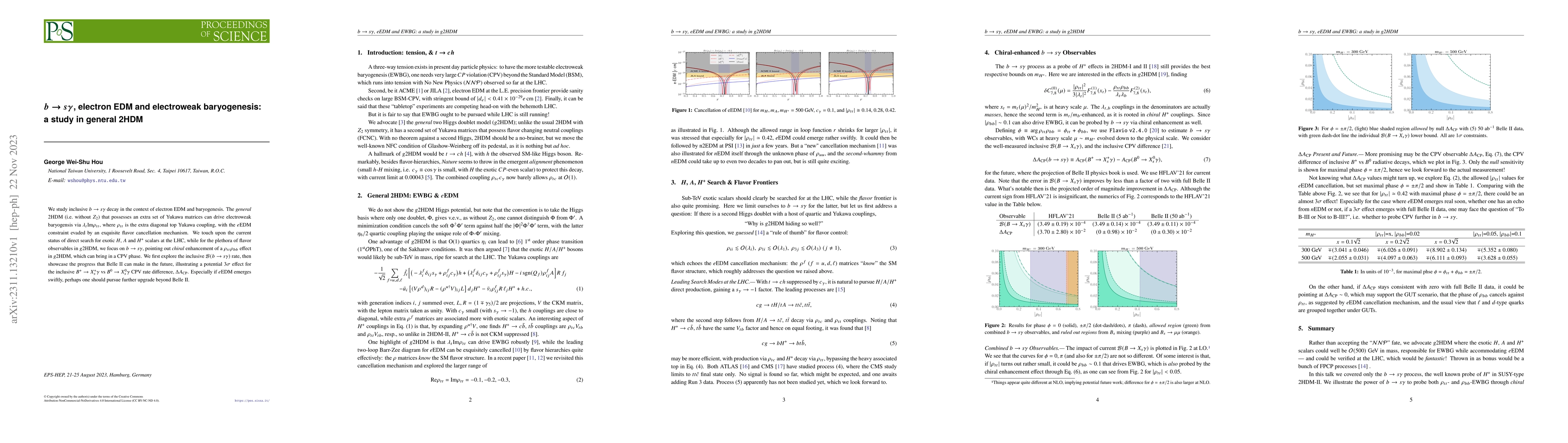 We study inclusive $b \to s\gamma$ decay in the context of electron EDM and baryogenesis. The general 2HDM (i.e. without $Z_2$) that possesses an extra set of Yukawa matrices can drive electroweak baryogensis via $\lambda_t {\rm Im}\rho_{tt}$, where $\rho_{tt}$ is the extra diagonal top Yukawa coupling, with the $e$EDM constraint evaded by an exquisite flavor cancellation mechanism. We touch upon the current status of direct search for exotic $H$, $A$ and $H^+$ scalars at the LHC, while for the plethora of flavor observables in $g$2HDM, we focus on $b\to s\gamma$, pointing out $chiral$ enhancement of a $\rho_{tt}\rho_{bb}$ effect in $g$2HDM, which can bring in a CPV phase. We first explore the inclusive ${\cal B}(b \to s\gamma)$ rate, then showcase the progress that Belle II can make in the future, illustrating a potential 3$\sigma$ effect for the inclusive $B^+ \to X_s^+\gamma$ vs $B^0 \to X_s^0\gamma$ CPV rate difference, $\Delta A_{\rm CP}$. Especially if $e$EDM emerges swiftly, perhaps one should pursue further upgrade beyond Belle II.