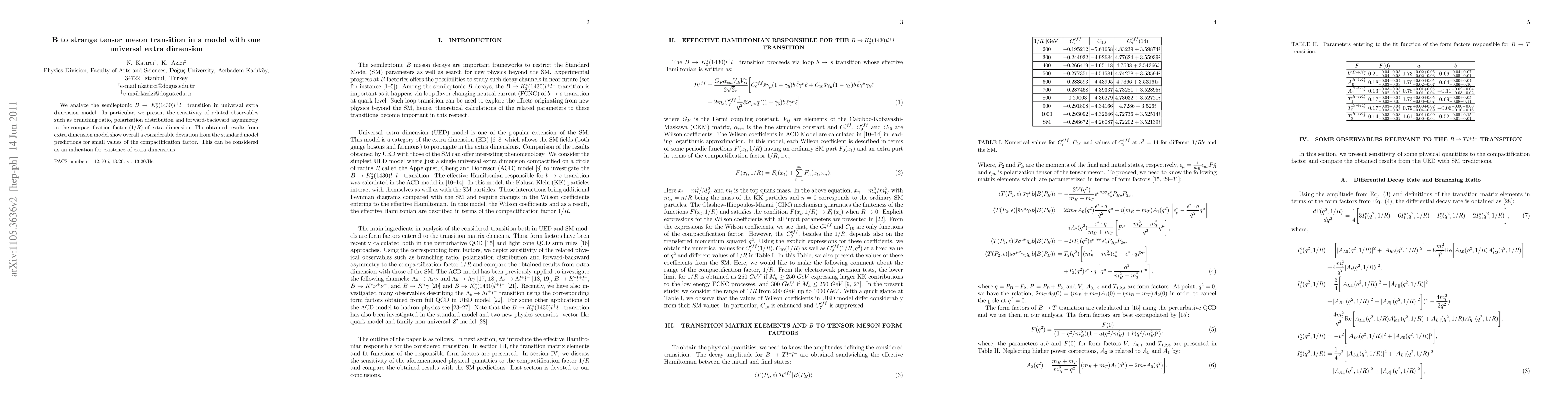 This paper investigates the semileptonic $B\to K_2^*(1430)l^+l^-$ transition in a model with one universal extra dimension, finding significant deviations from standard model predictions for small compactification factors, suggesting potential evidence for extra dimensions.