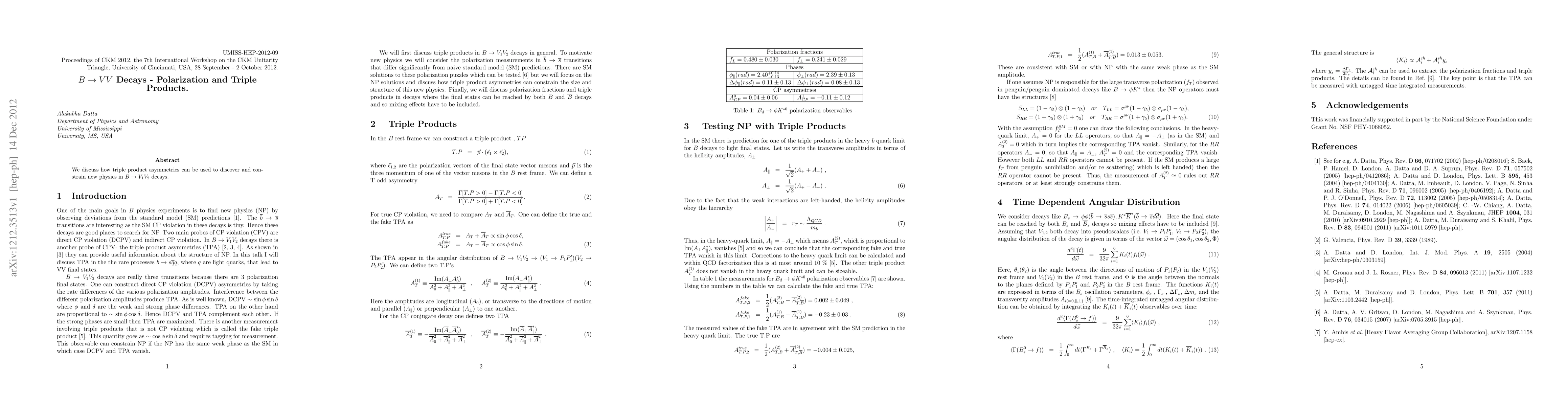 We discuss how triple product asymmetries can be used to discover and constrain new physics in $B \to VV$ decays.