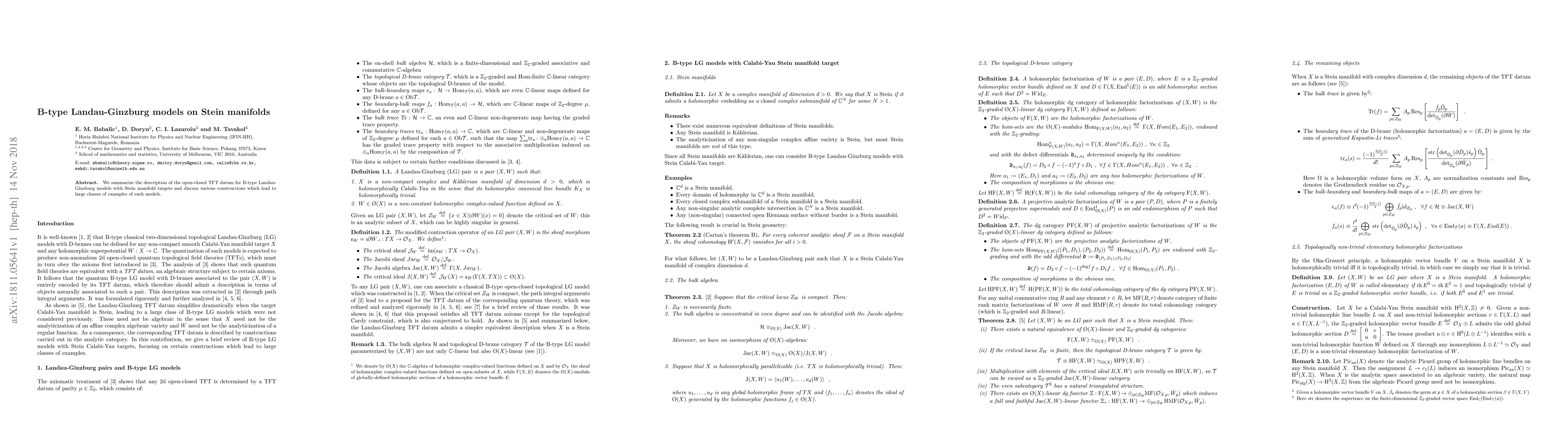 We summarize the description of the open-closed TFT datum for B-type Landau-Ginzburg models with Stein manifold targets and discuss various constructions which lead to large classes of examples of such models.