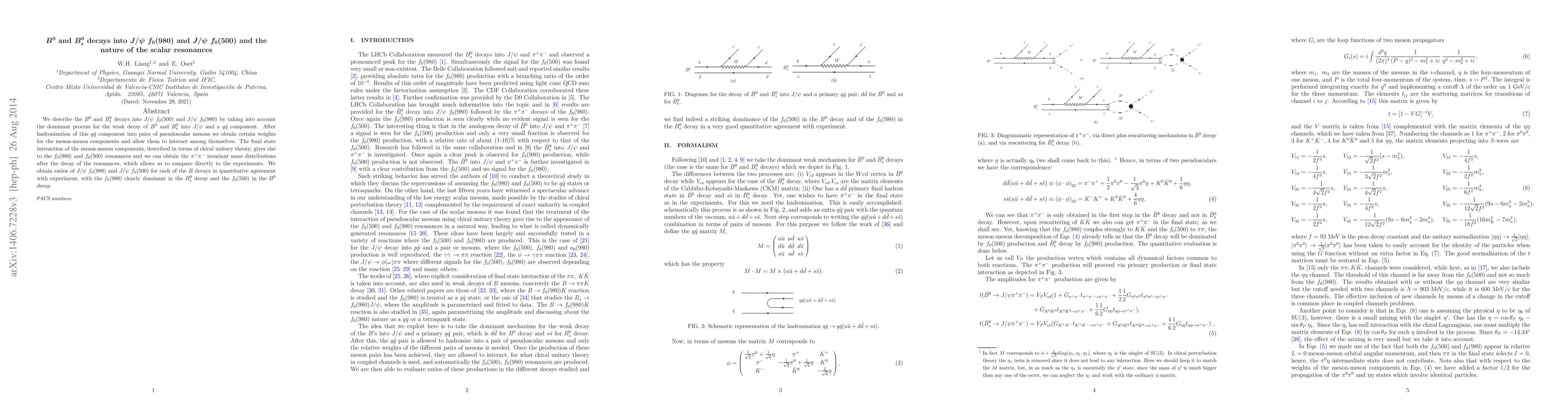 This paper investigates the $B^0$ and $B^0_s$ decays into $J/\psi$ accompanied by $f_0(980)$ and $f_0(500)$ mesons, using chiral unitary theory to describe the final state interactions. The study finds that $f_0(980)$ dominates in $B^0_s$ decays while $f_0(500)$ is more prevalent in $B^0$ decays, in quantitative agreement with experimental results.