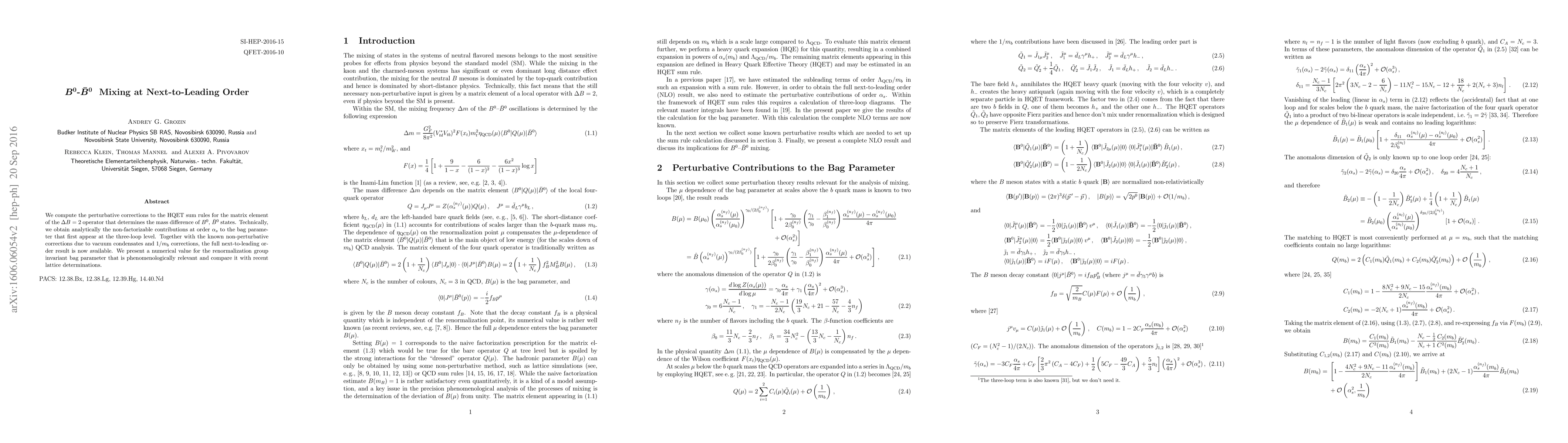 This paper calculates next-to-leading order perturbative corrections to the HQET sum rules for $B^0-\bar{B}^0$ mixing, providing the non-factorizable contributions at order $\alpha_s$ and presenting the full next-to-leading order result. The study also compares the phenomenologically relevant renormalization group invariant bag parameter with recent lattice determinations.