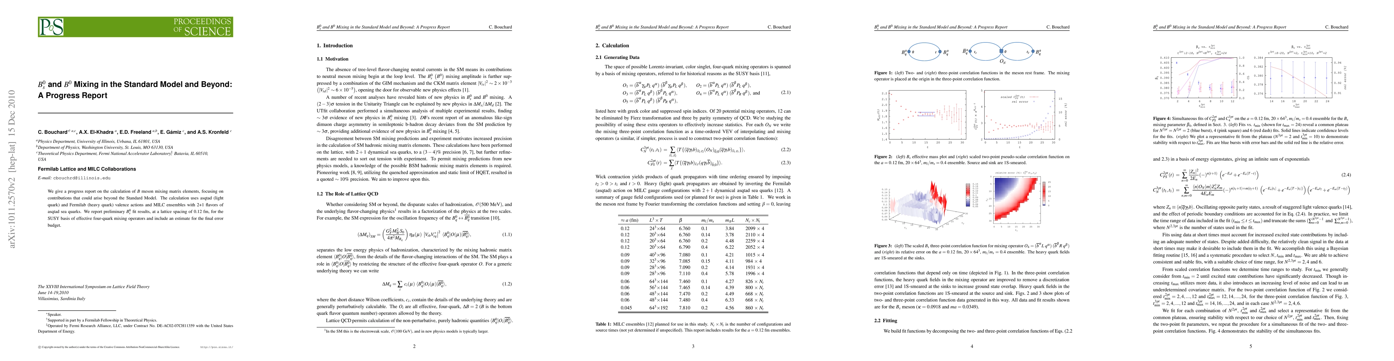 This paper provides an update on B meson mixing calculations, emphasizing potential contributions beyond the Standard Model. It employs asqtad and Fermilab valence actions with MILC ensembles and reports preliminary B^0_s mixing results, including an error budget estimate.