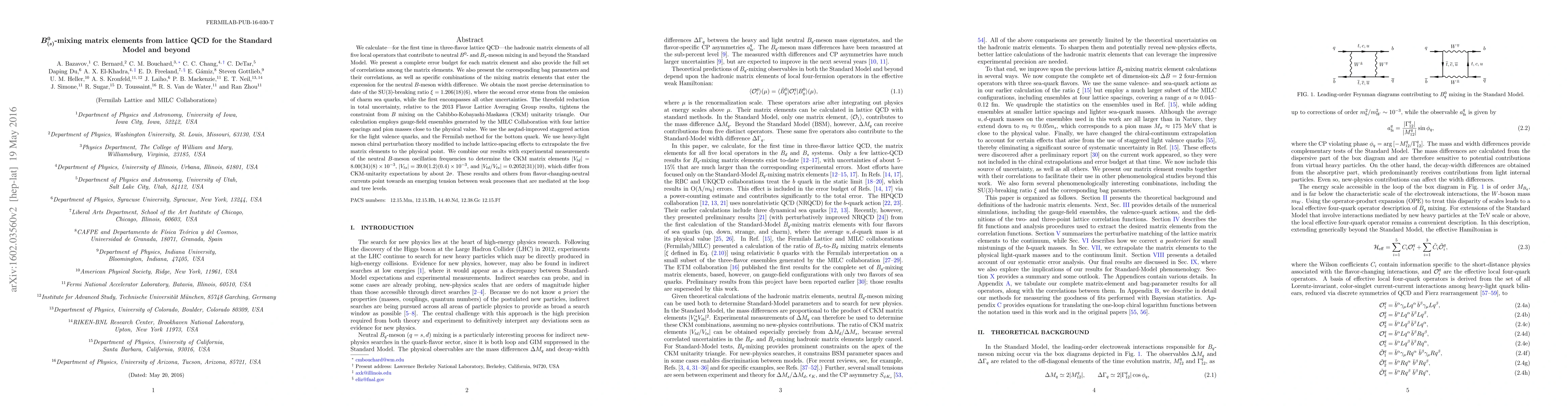 We calculate---for the first time in three-flavor lattice QCD---the hadronic matrix elements of all five local operators that contribute to neutral $B^0$- and $B_s$-meson mixing in and beyond the Standard Model. We present a complete error budget for each matrix element and also provide the full set of correlations among the matrix elements. We also present the corresponding bag parameters and their correlations, as well as specific combinations of the mixing matrix elements that enter the expression for the neutral $B$-meson width difference. We obtain the most precise determination to date of the SU(3)-breaking ratio $\xi = 1.206(18)(6)$, where the second error stems from the omission of charm sea quarks, while the first encompasses all other uncertainties. The threefold reduction in total uncertainty, relative to the 2013 Flavor Lattice Averaging Group results, tightens the constraint from $B$ mixing on the Cabibbo-Kobayashi-Maskawa (CKM) unitarity triangle. Our calculation employs gauge-field ensembles generated by the MILC Collaboration with four lattice spacings and pion masses close to the physical value. We use the asqtad-improved staggered action for the light valence quarks, and the Fermilab method for the bottom quark. We use heavy-light meson chiral perturbation theory modified to include lattice-spacing effects to extrapolate the five matrix elements to the physical point. We combine our results with experimental measurements of the neutral $B$-meson oscillation frequencies to determine the CKM matrix elements $|V_{td}| = 8.00(34)(8) \times 10^{-3}$, $|V_{ts}| = 39.0(1.2)(0.4) \times 10^{-3}$, and $|V_{td}/V_{ts}| = 0.2052(31)(10)$, which differ from CKM-unitarity expectations by about 2$\sigma$. These results and others from flavor-changing-neutral currents point towards an emerging tension between weak processes that are mediated at the loop and tree levels.