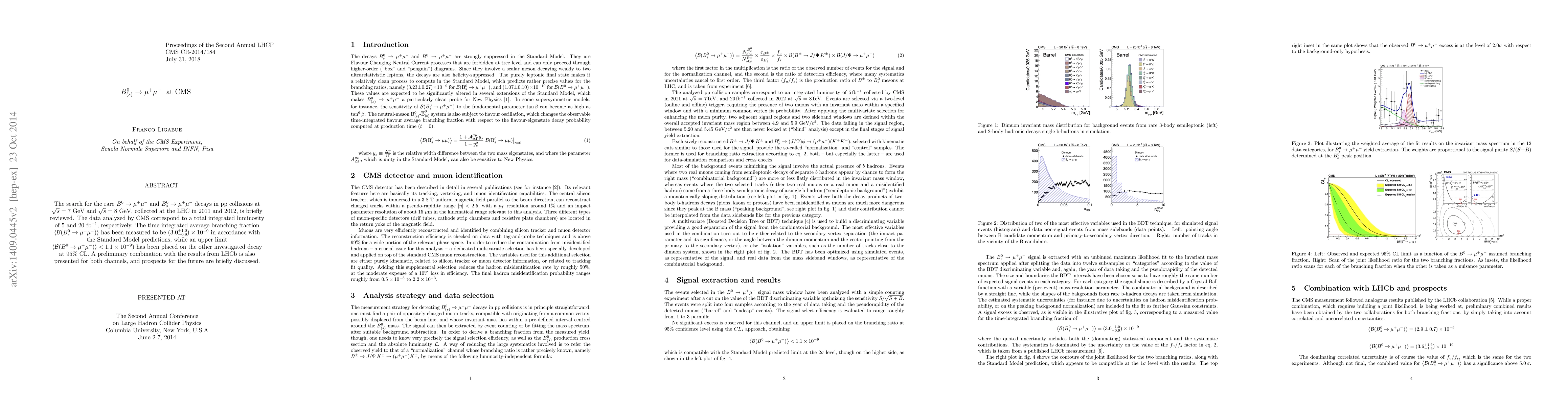 The CMS experiment reports measurements of the rare decays $B^0 \rightarrow \mu^+\mu^-$ and $B_s^0 \rightarrow \mu^+\mu^-$ in proton-proton collisions at the LHC, finding a branching fraction of $(3.0 \pm 1.0) \times 10^{-9}$ for $B_s^0$ decay consistent with Standard Model predictions, and an upper limit of $< 1.1 \times 10^{-9}$ for $B^0$ decay at 95% CL.