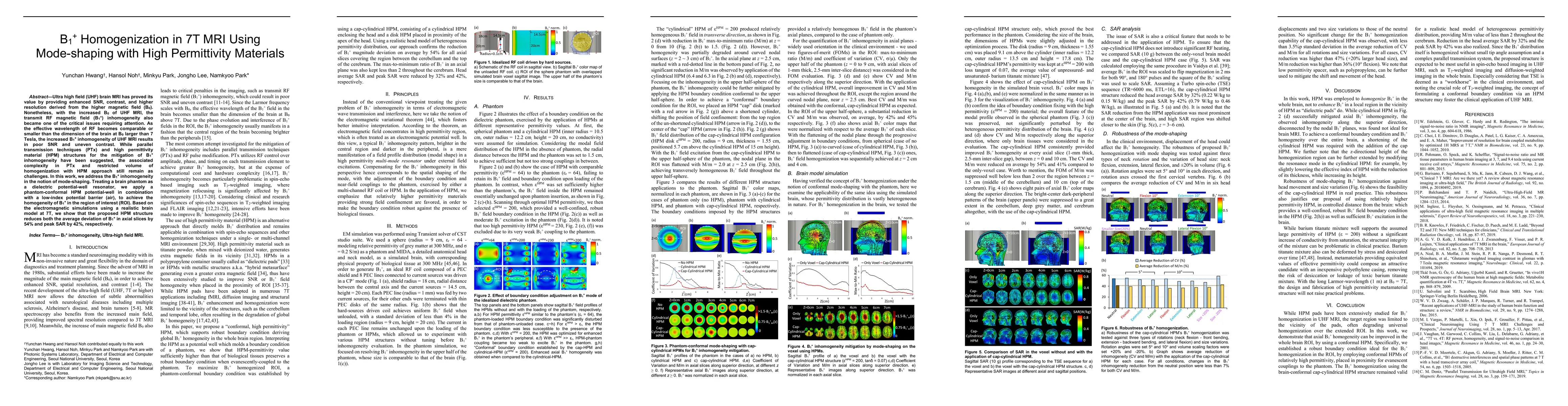 This paper proposes a mode-shaping approach using high permittivity materials (HPM) to mitigate B1+ inhomogeneity in 7T MRI, achieving a 54% reduction in average B1+ deviation and a 42% reduction in peak SAR through a phantom-conformal HPM potential-well combined with an air barrier. The method aims to enhance SNR and contrast in ultra-high field brain MRI.