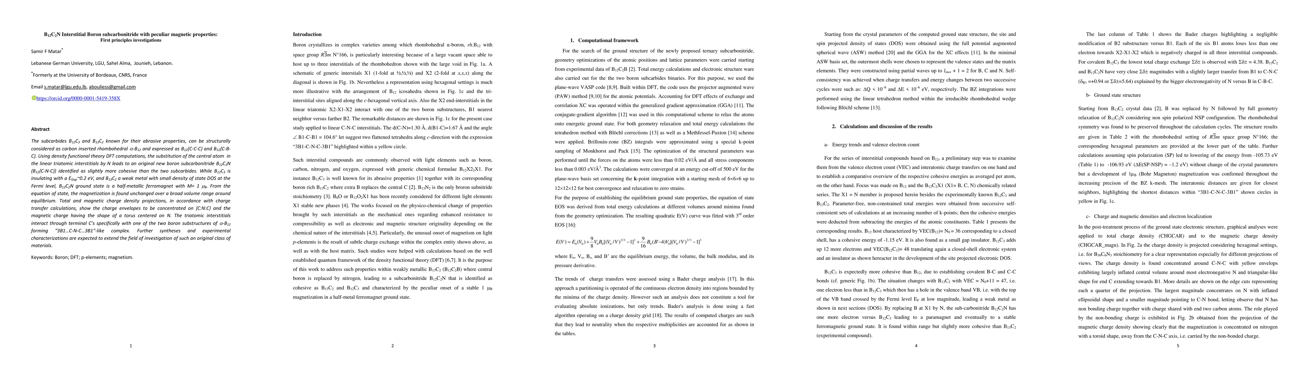 The subcarbides B12C3 and B13C2 known for their abrasive properties, can be structurally considered as carbon inserted rhombohedral alpha-B12 and expressed as B12{C-C-C} and B12(C-B-C). Using density functional theory DFT computations, the substitution of the central atom in the linear triatomic interstitials by N leads to an original new boron subcarbonitride B12C2N or B12(C-N-C) identified as slightly more cohesive than the two subcarbides. While B12C3 is insulating with a E(Gap) close to 0.2 eV, and B13C2 a weak metal with small density of state DOS at the Fermi level, B12C2N ground state is a half-metallic ferromagnet with M= 1 BM. From the equation of state, the magnetization is found unchanged over a broad volume range around equilibrium. Total and magnetic charge density projections, in accordance with charge transfer calculations, show the charge envelopes to be concentrated on (C:N:C) and the magnetic charge having the shape of a torus centered on N. The triatomic interstitials interact through terminal carbons specifically with one of the two boron substructures of alpha-B12 forming 3B1-C-N-C-3B1-like complex. Further syntheses and experimental characterizations are expected to extend the field of investigation of such an original class of materials.