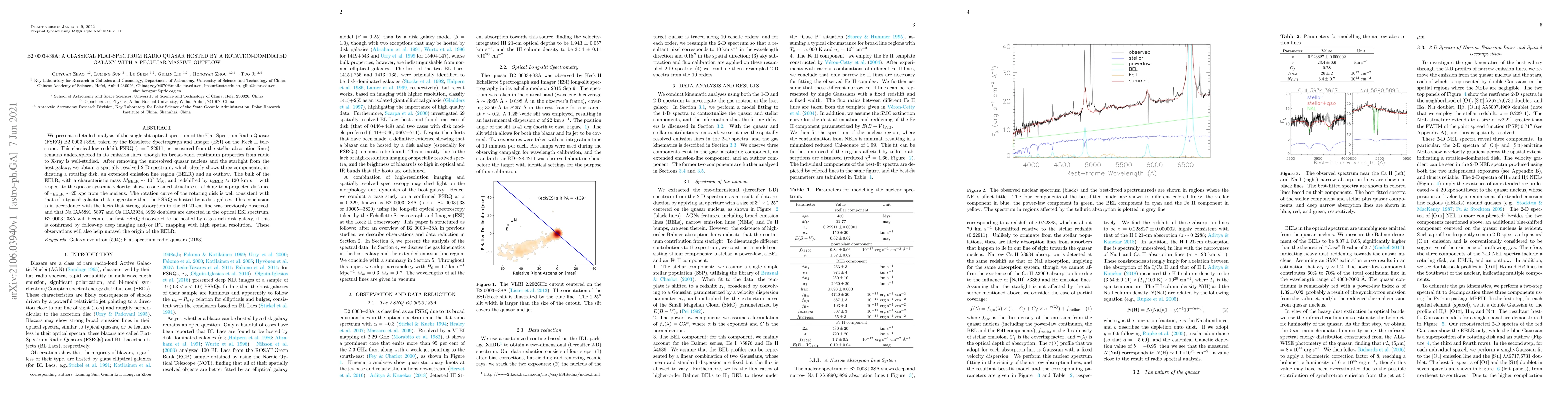 The research utilized a detailed analysis of the single-slit optical spectrum of the Flat-Spectrum Radio Quasar (FSRQ) B2 0003+38A, obtained with the Echellette Spectrograph and Imager (ESI) on the Keck II telescope. The spectrum was decomposed into components to study the rotating disk, extended emission line region (EELR), and an outflow.