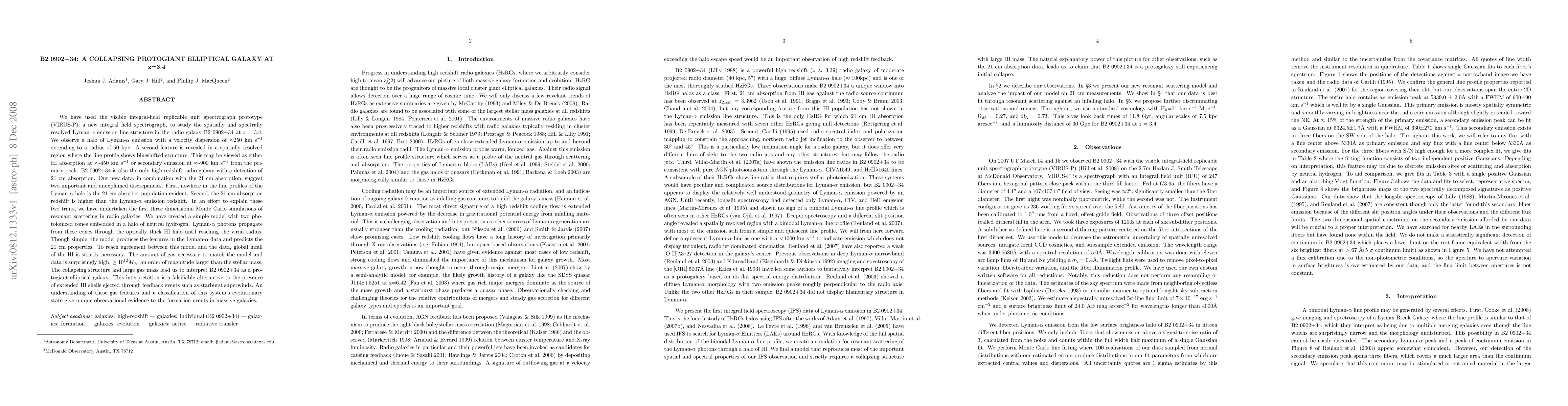 This paper uses VIRUS-P to study the Lyman-alpha emission in B2 0902+34, revealing a high-velocity halo and a blueshifted feature. The data suggest discrepancies between 21 cm absorption and Lyman-alpha emission, leading to the interpretation of B2 0902+34 as a collapsing protogiant elliptical galaxy with a massive gas reservoir.