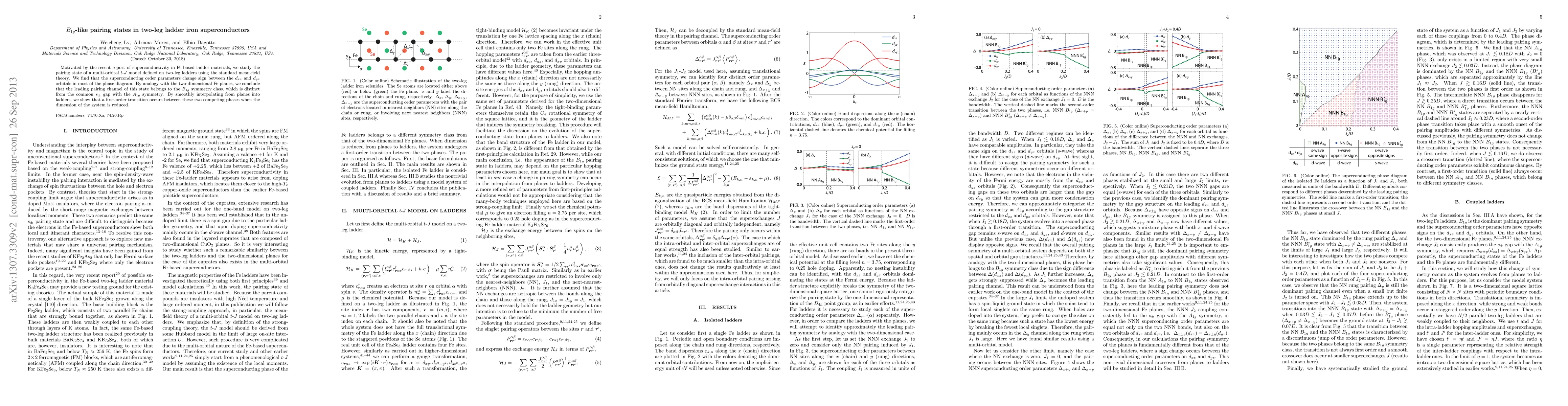 Motivated by the recent report of superconductivity in Fe-based ladder materials, we study the pairing state of a multi-orbital t-J model defined on two-leg ladders using the standard mean-field theory. We find that the superconducting order parameters change sign between the $d_{xz}$ and $d_{yz}$ orbitals in most of the phase diagram. By analogy with the two-dimensional Fe planes, we conclude that the leading pairing channel of this state belongs to the $B_{1g}$ symmetry class, which is distinct from the common $s_{\pm}$ gap with the $A_{1g}$ symmetry. By smoothly interpolating from planes into ladders, we show that a first-order transition occurs between these two competing phases when the dimension of the system is reduced.