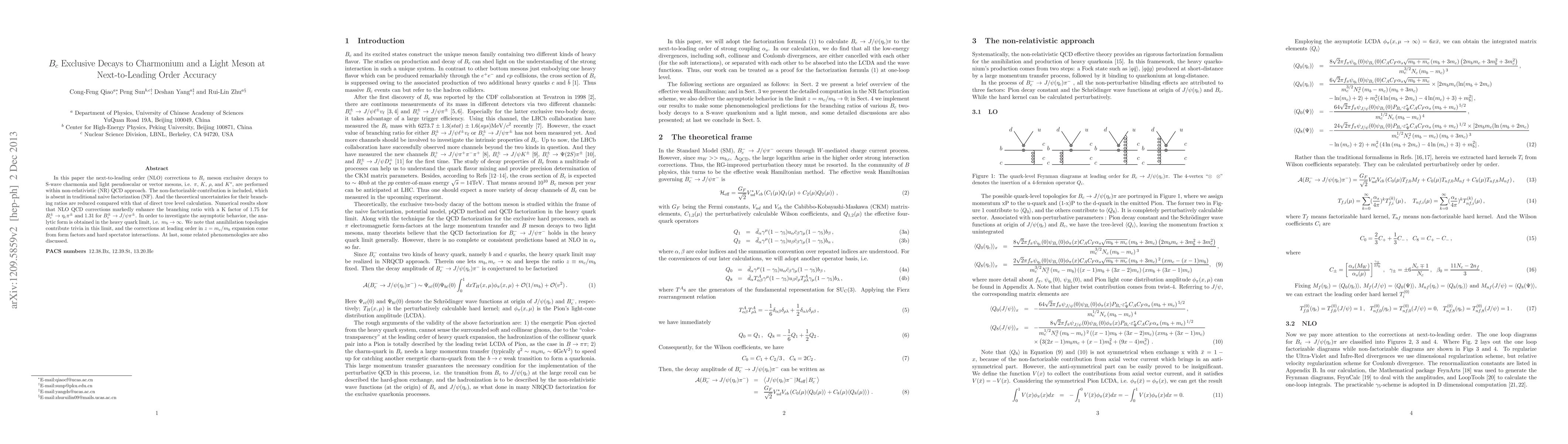 This paper calculates next-to-leading order (NLO) corrections for $B_c$ meson decays to charmonium and light mesons using the non-relativistic QCD approach, including non-factorizable contributions. The results show significant enhancements in branching ratios with K factors of 1.75 and 1.31 for specific decay channels, and the study also discusses the asymptotic behavior in the heavy quark limit.