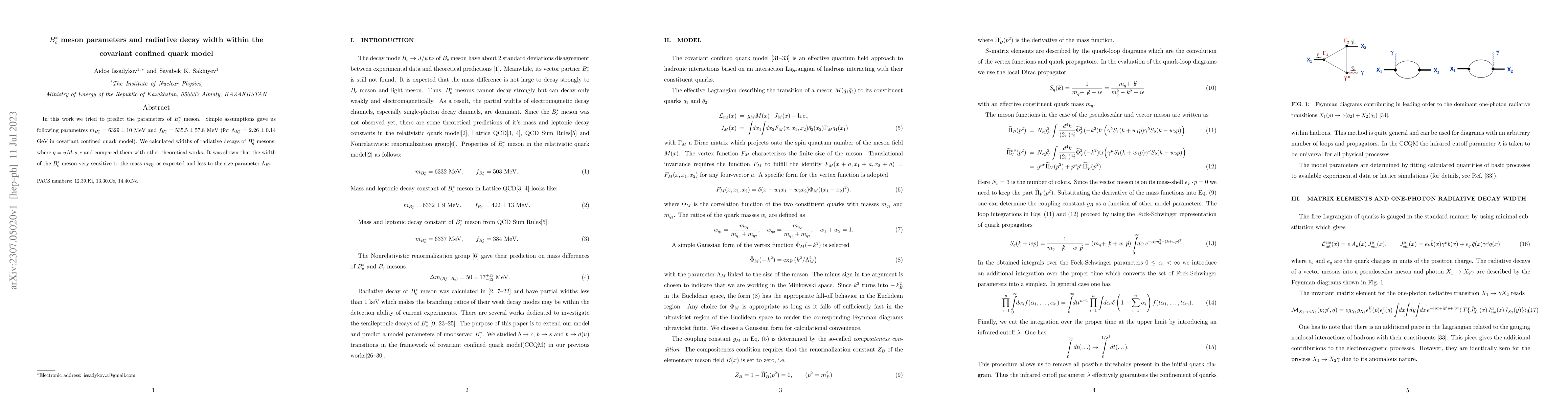 In this work we tried to predict the parameters of $B^{*}_c$ meson. Simple assumptions gave us following parametres $m_{B_{c}^{*}}=6329\pm 10$ MeV and $f_{B_{c}^{*}}= 535.5\pm57.8$ MeV (for $\Lambda_{B_{c}^{*}}=2.26\pm 0.14$ GeV in covariant confined quark model). We calculated widths of radiative decays of $B^*_{q}$ mesons, where $q=u/d,s,c$ and compared them with other theoretical works. It was shown that the width of the $B_{c}^{*}$ meson very sensitive to the mass $m_{B_{c}^{*}}$ as expected and less to the size parameter $\Lambda_{B_{c}^{*}}$.