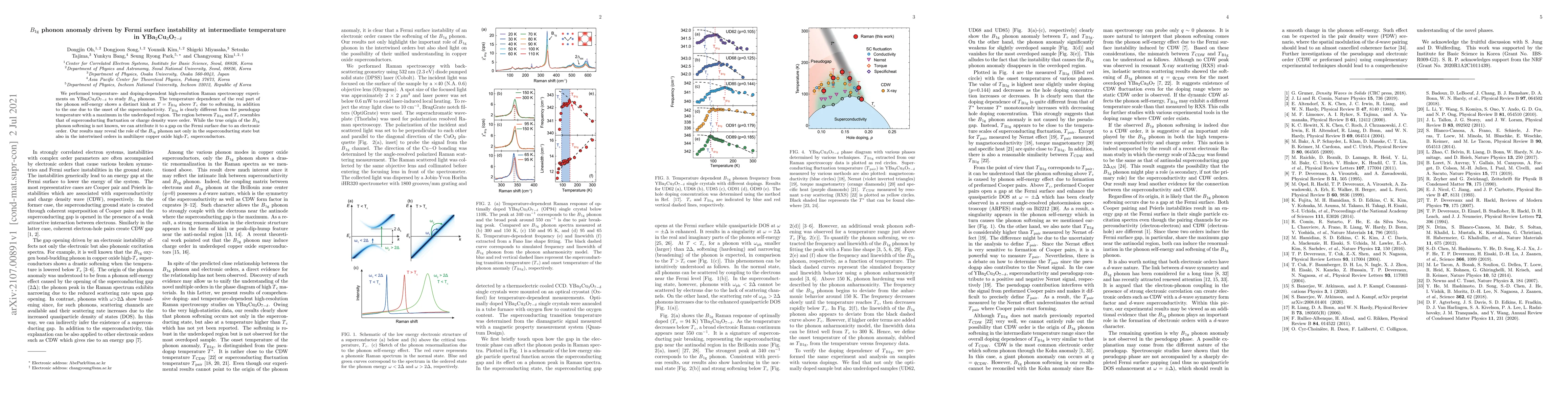We performed temperature- and doping-dependent high-resolution Raman spectroscopy experiments on YBa$_2$Cu$_3$O$_{7-\delta}$ to study $B$$_{\rm 1g}$ phonons. The temperature dependence of the real part of the phonon self-energy shows a distinct kink at $T=T_{\rm B1g}$ above $T$$_{\rm c}$ due to softening, in addition to the one due to the onset of the superconductivity. $T$$_{\rm B1g}$ is clearly different from the pseudogap temperature with a maximum in the underdoped region. The region between $T$$_{\rm B1g}$ and $T$$_{\rm c}$ resembles that of superconducting fluctuation or charge density wave order. While the true origin of the $B$$_{\rm 1g}$ phonon softening is not known, we can attribute it to a gap on the Fermi surface due to an electronic order. Our results may reveal the role of the $B$$_{\rm 1g}$ phonon not only in the superconducting state but also in the intertwined orders in multilayer copper oxide high-$T$$_{\rm c}$ superconductors.