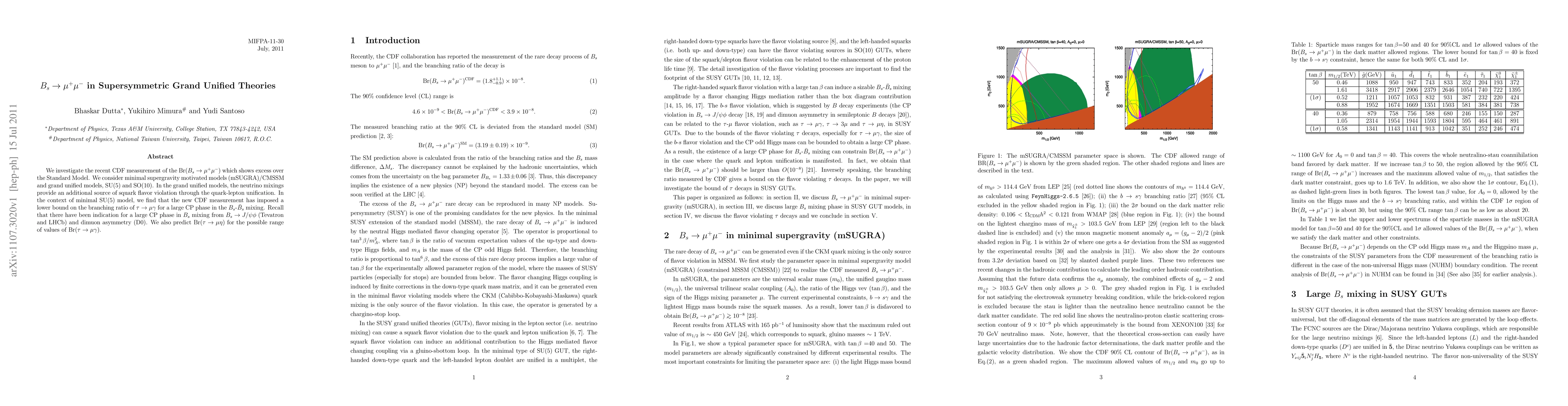 We investigate the recent CDF measurement of the Br(B_s --> mu+mu-) which shows excess over the Standard Model. We consider minimal supergravity motivated models (mSUGRA)/CMSSM and grand unified models, SU(5) and SO(10). In the grand unified models, the neutrino mixings provide an additional source of squark flavor violation through the quark-lepton unification. In the context of minimal SU(5) model, we find that the new CDF measurement has imposed a lower bound on the branching ratio of tau --> mu gamma for a large CP phase in the B_s-bar B_s mixing. Recall that there have been indication for a large CP phase in B_s mixing from B_s --> J/psi phi (Tevatron and LHCb) and dimuon asymmetry (D0). We also predict Br(tau --> mu eta) for the possible range of values of Br(tau --> mu gamma).