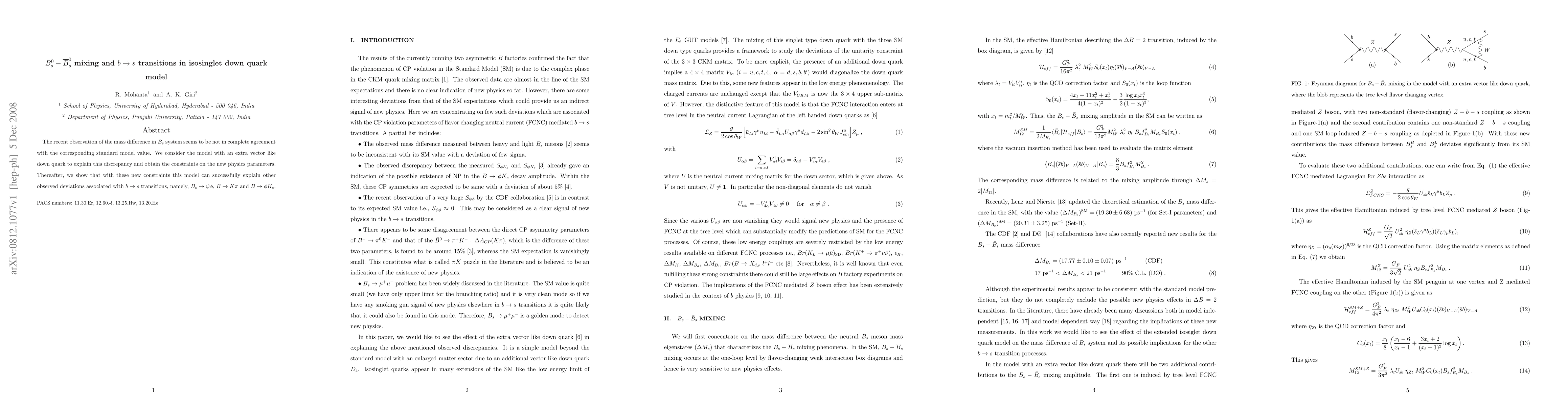 The recent observation of the mass difference in $B_s$ system seems to be not in complete agreement with the corresponding standard model value. We consider the model with an extra vector like down quark to explain this discrepancy and obtain the constraints on the new physics parameters. Thereafter, we show that with these new constraints this model can successfully explain other observed deviations associated with $b \to s$ transitions, namely, $B_s \to \psi \phi$, $B\to K \pi$ and $B\to \phi K_s$.
