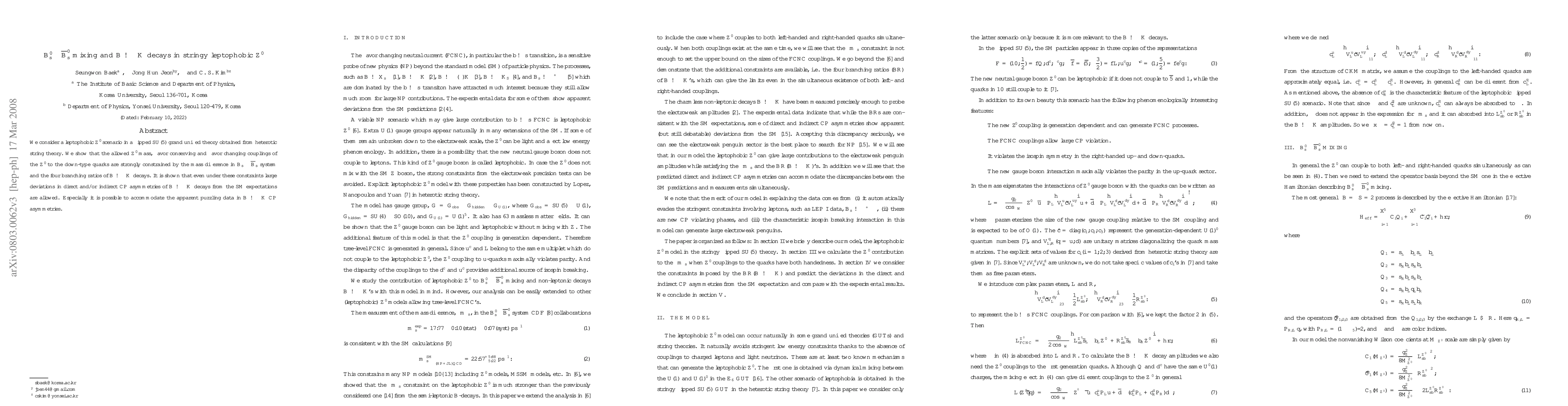 This paper explores a leptophobic Z′ scenario in a flipped SU(5) grand unified theory derived from string theory, demonstrating how Z′ mass and couplings are constrained by B_s-\bar{B}_s mixing and B -> \pi K decay branching ratios. It concludes that despite these constraints, significant deviations in B -> \pi K CP asymmetries from Standard Model predictions remain possible.