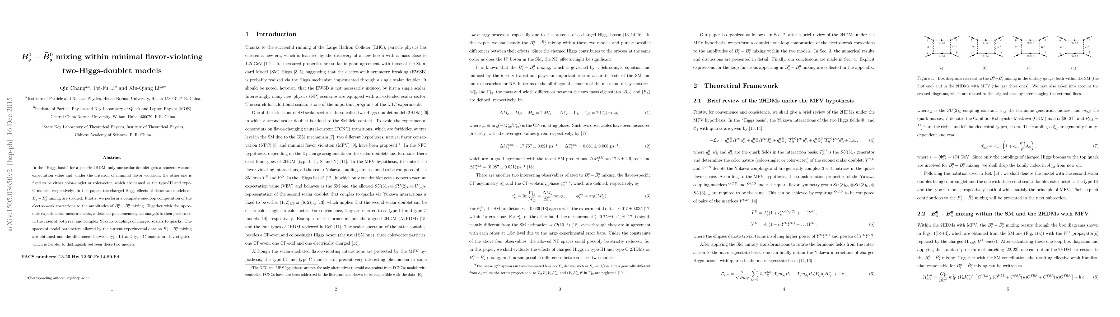 This paper studies $B_s^0-\bar{B}_s^0$ mixing within minimal flavor-violating two-Higgs-doublet models, focusing on type-III and type-C models. It performs a detailed one-loop computation of electroweak corrections and analyzes the implications for distinguishing between these models based on current experimental data.