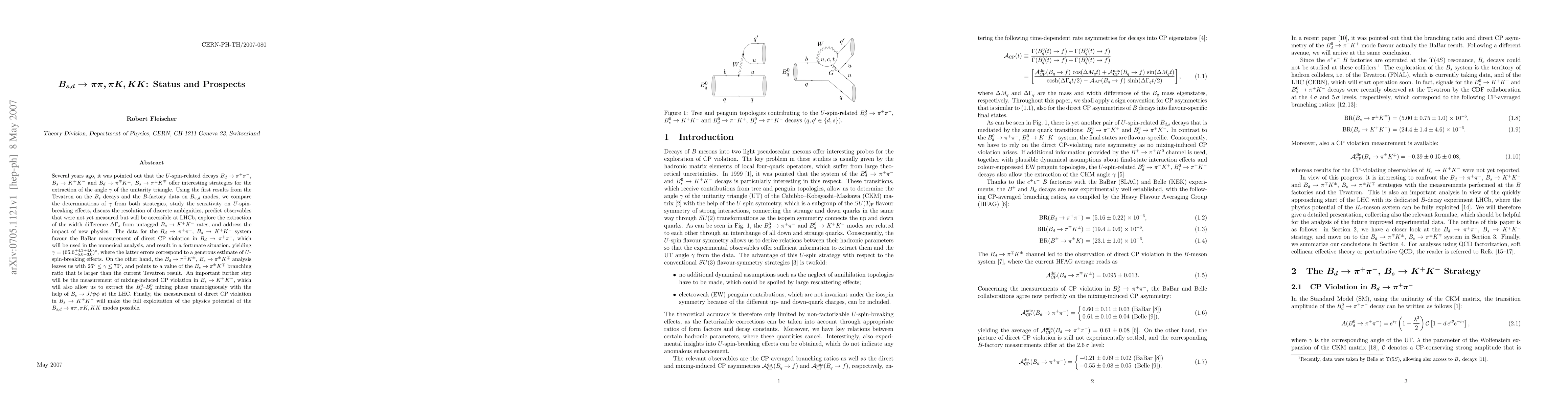 Several years ago, it was pointed out that the U-spin-related decays $B_d\to\pi^+\pi^-$, $B_s\to K^+K^-$ and $B_d\to\pi^\mp K^\pm$, $B_s\to \pi^\pm K^\mp$ offer interesting strategies for the extraction of the angle gamma of the unitarity triangle. Using the first results from the Tevatron on the $B_s$ decays and the B-factory data on $B_{u,d}$ modes, we compare the determinations of gamma from both strategies, study the sensitivity on U-spin-breaking effects, discuss the resolution of discrete ambiguities, predict observables that were not yet measured but will be accessible at LHCb, explore the extraction of the width difference $\Delta\Gamma_s$ from untagged $B_s\to K^+K^-$ rates, and address the impact of new physics. The data for the $B_d\to\pi^+\pi^-$, $B_s\to K^+K^-$ system favour the BaBar measurement of direct CP violation in $B_d\to\pi^+\pi^-$, which will be used in the numerical analysis, and result in a fortunate situation, yielding $\gamma=(66.6^{+4.3+4.0}_{-5.0-3.0})^\circ$, where the latter errors correspond to a generous estimate of U-spin-breaking effects. On the other hand, the $B_d\to\pi^\mp K^\pm$, $B_s\to \pi^\pm K^\mp$ analysis leaves us with $26^\circ\leq\gamma\leq70^\circ$, and points to a value of the $B_s\to \pi^\pm K^\mp$ branching ratio that is larger than the current Tevatron result. An important further step will be the measurement of mixing-induced CP violation in $B_s\to K^+K^-$, which will also allow us to extract the $B^0_s$--$\bar B^0_s$ mixing phase unambiguously with the help of $B_s\to J/\psi \phi$ at the LHC. Finally, the measurement of direct CP violation in $B_s\to K^+K^-$ will make the full exploitation of the physics potential of the $B_{s,d}\to \pi\pi, \pi K, KK$ modes possible.