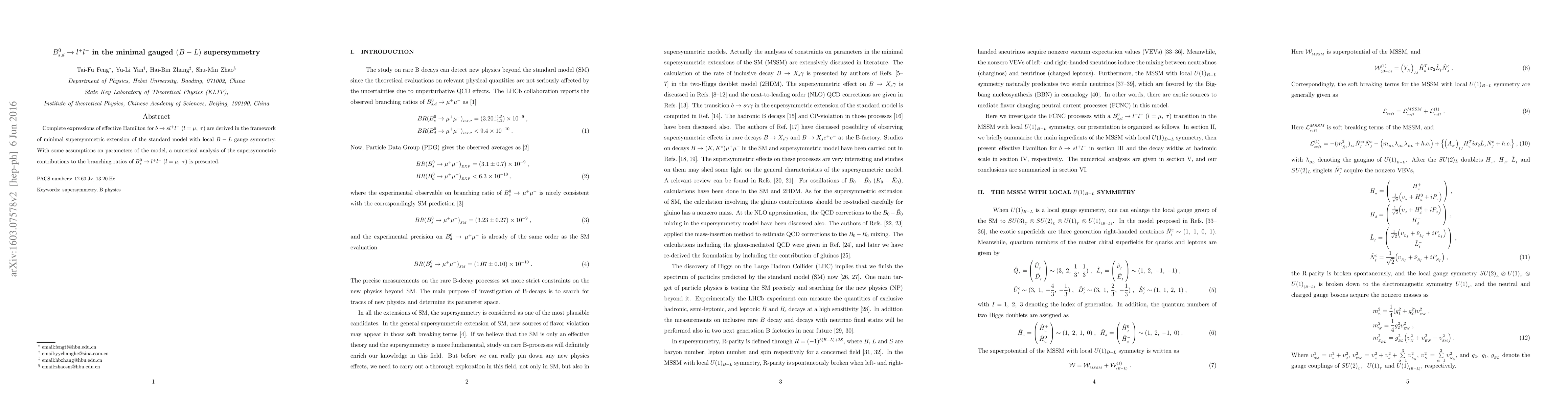 This paper derives complete expressions for the effective Hamiltonian governing $b\rightarrow sl^+l^-$ decays in the minimal gauged $(B-L)$ supersymmetry framework. It then performs a numerical analysis to evaluate supersymmetric contributions to the branching ratios of $B_s^0\rightarrow l^+l^-$ decays for leptons $\mu$ and $\tau$.