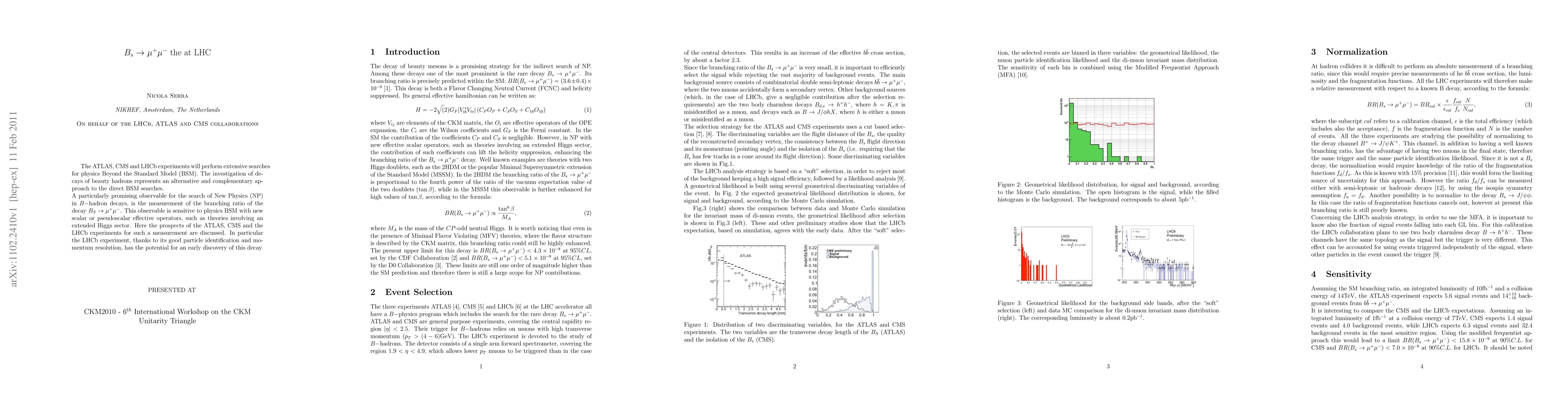 The ATLAS, CMS and LHCb experiments will perform extensive searches for physics Beyond the Standard Model (BSM). The investigation of decays of beauty hadrons represents an alternative and complementary approach to the direct BSM searches. A particularly promising observable for the search of New Physics (NP) in $B-$hadron decays, is the measurement of the branching ratio of the decay $B_S\to \mu^{+} \mu^{-}$. This observable is sensitive to physics BSM with new scalar or pseudoscalar effective operators, such as theories involving an extended Higgs sector. Here the prospects of the ATLAS, CMS and the LHCb experiments for such a measurement are discussed. In particular the LHCb experiment, thanks to its good particle identification and momentum resolution, has the potential for an early discovery of this decay.